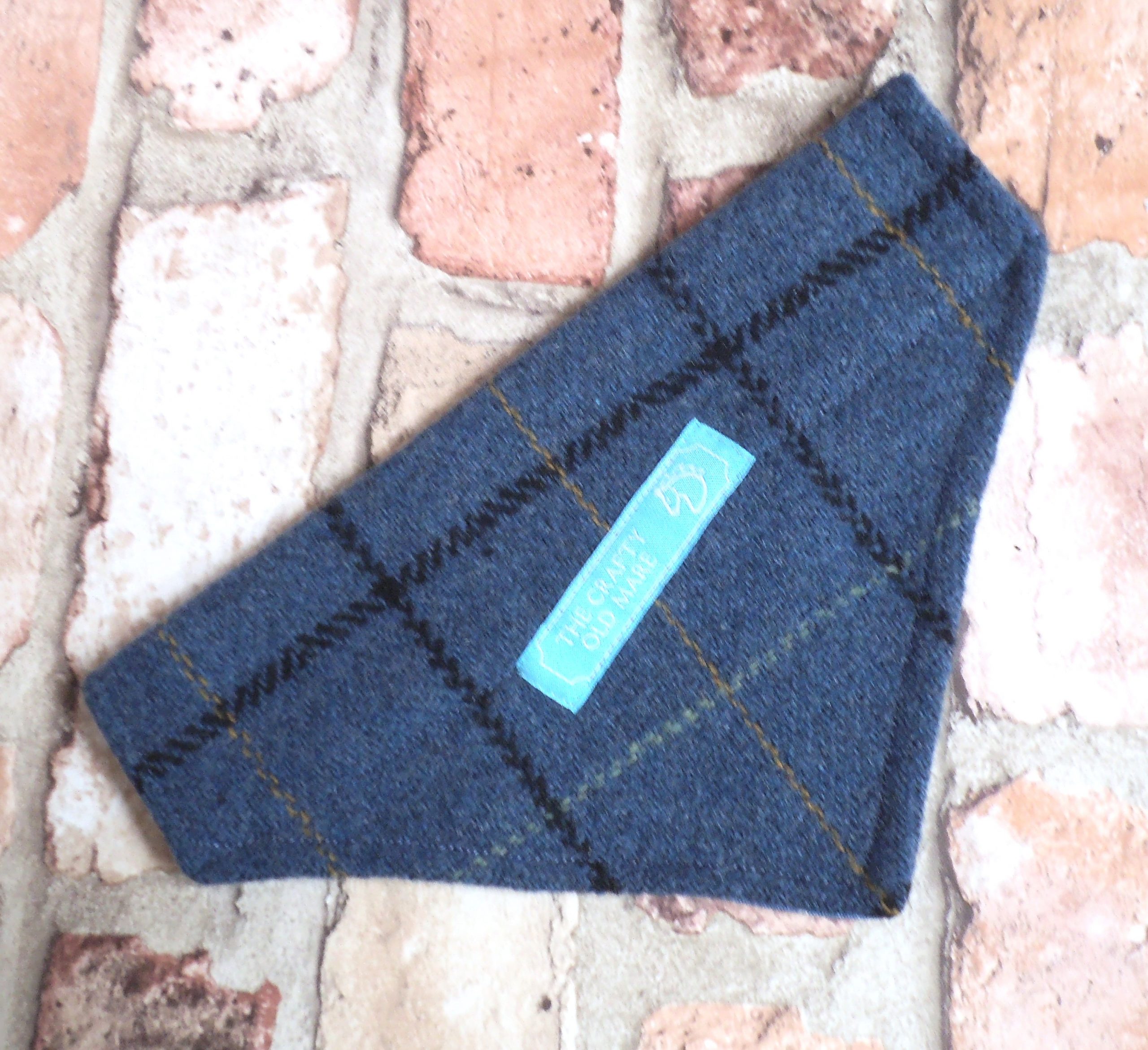 Blue Tweed Pet Bandana. Olive green with black, beige and and green check running through the fabric. Lined with blue printed cotton. Reversible so could be worn with the cotton side showing. Slides easily onto collar to dress up your pet! Branded with an embroidered TCOM label on Tweed side. Size approx 20cm (at widest point of collar sleeve) x 13cm (from top of sleeve to point/tip). Designed to fit a collar 30mm – 35mm wide depending on thickness of collar and size of collar fastenings. Hand-wash, do not tumble dry.