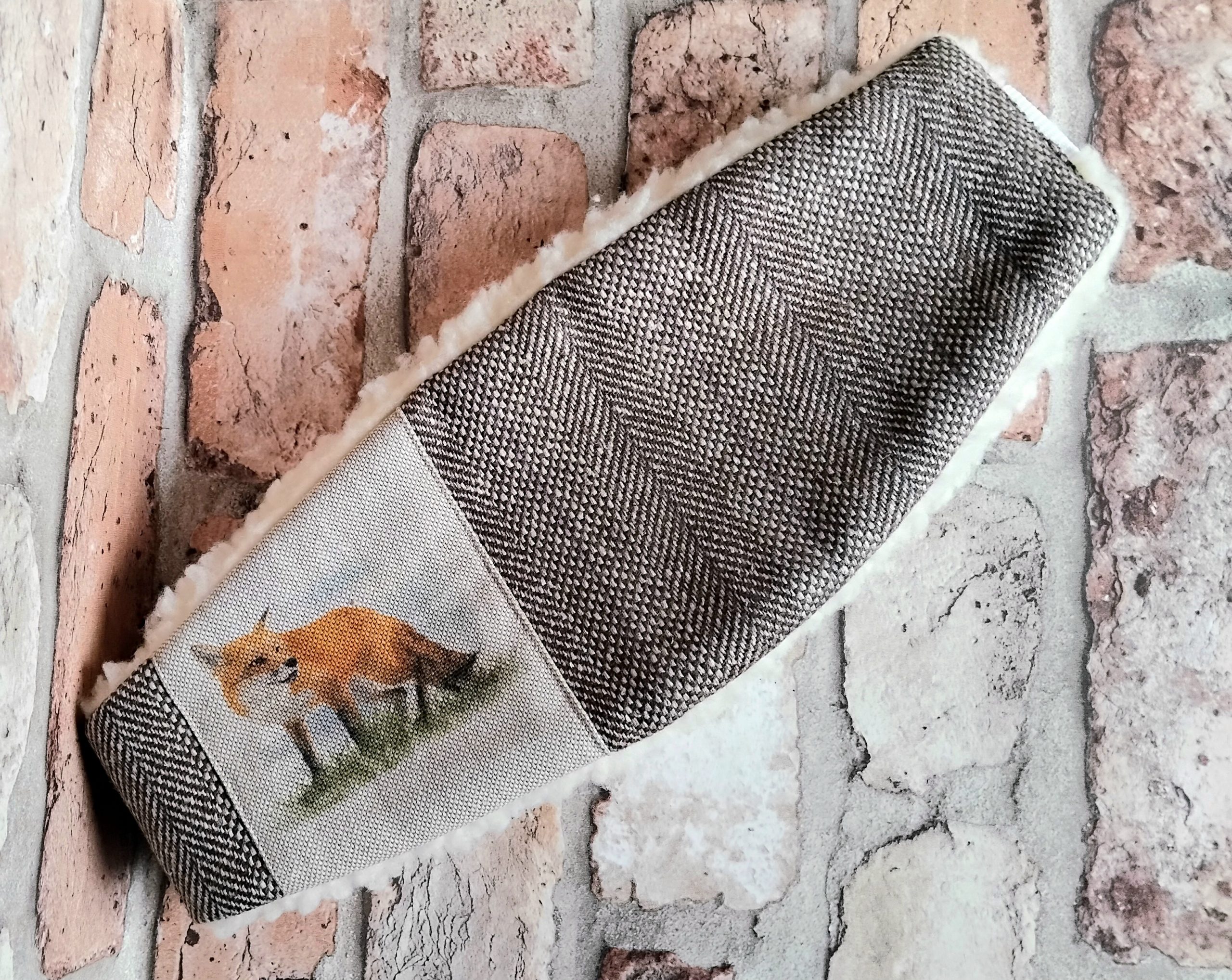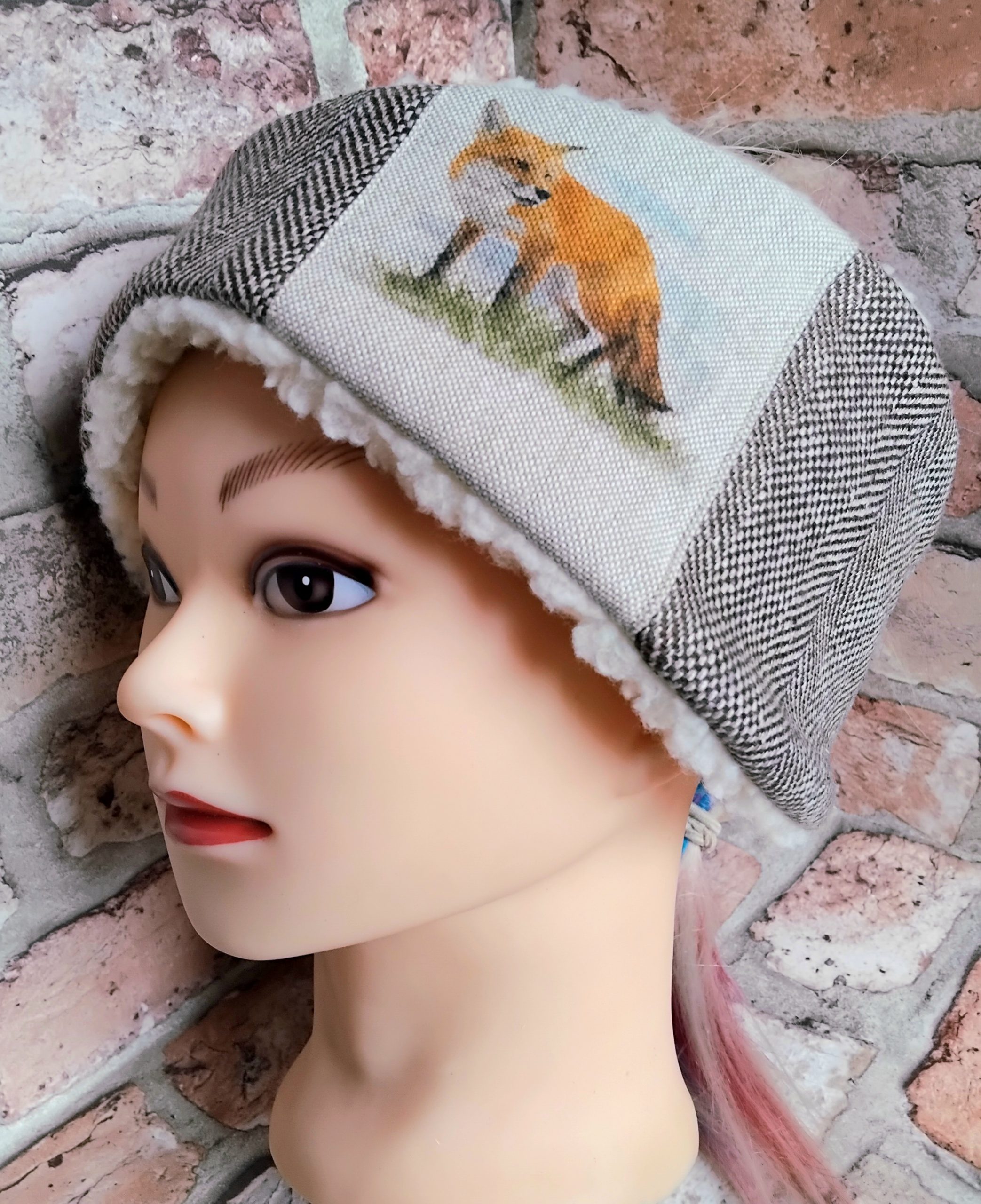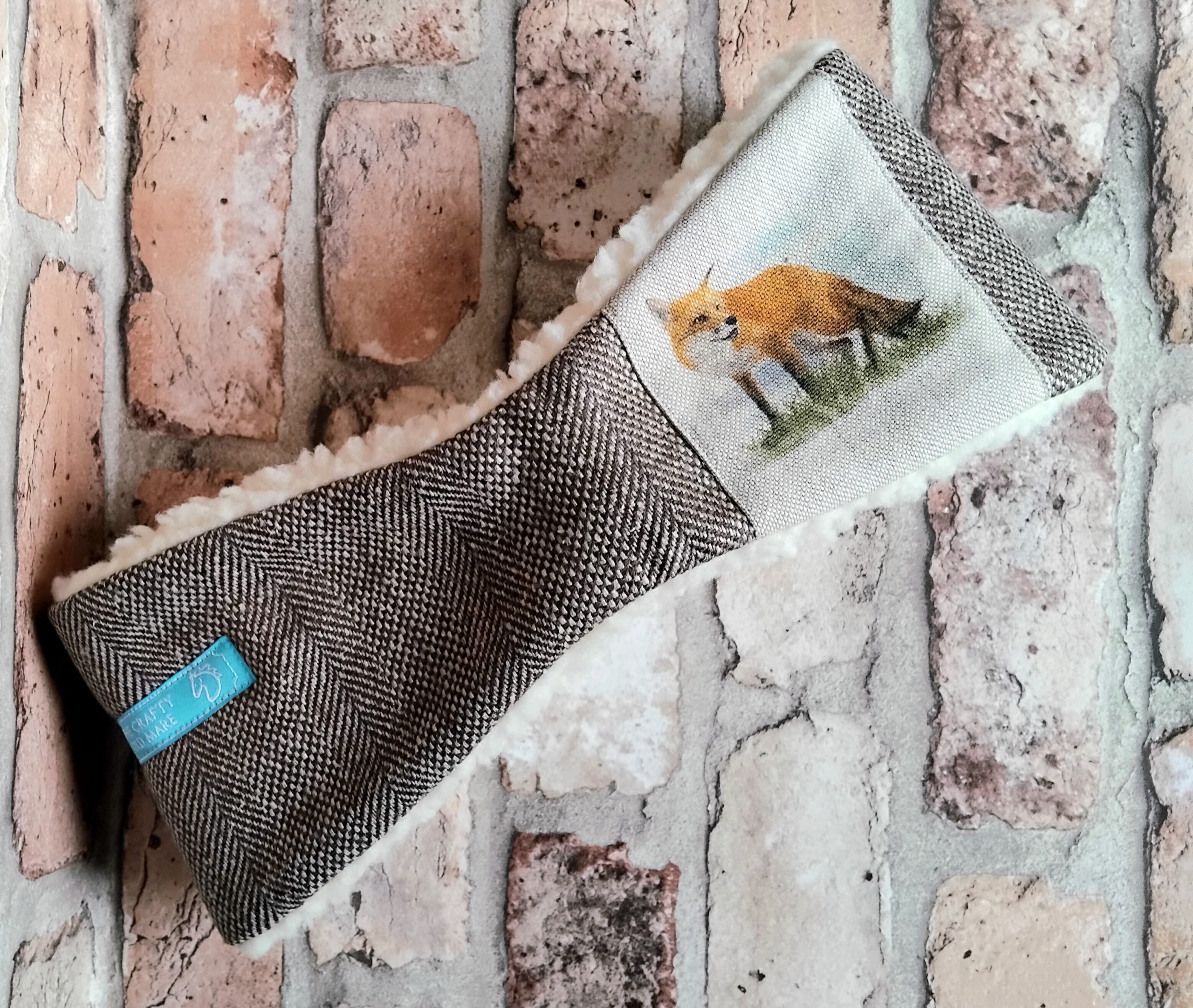 Brown Herringbone Tweed Ear-warmer with Fox printed detail; size M/L