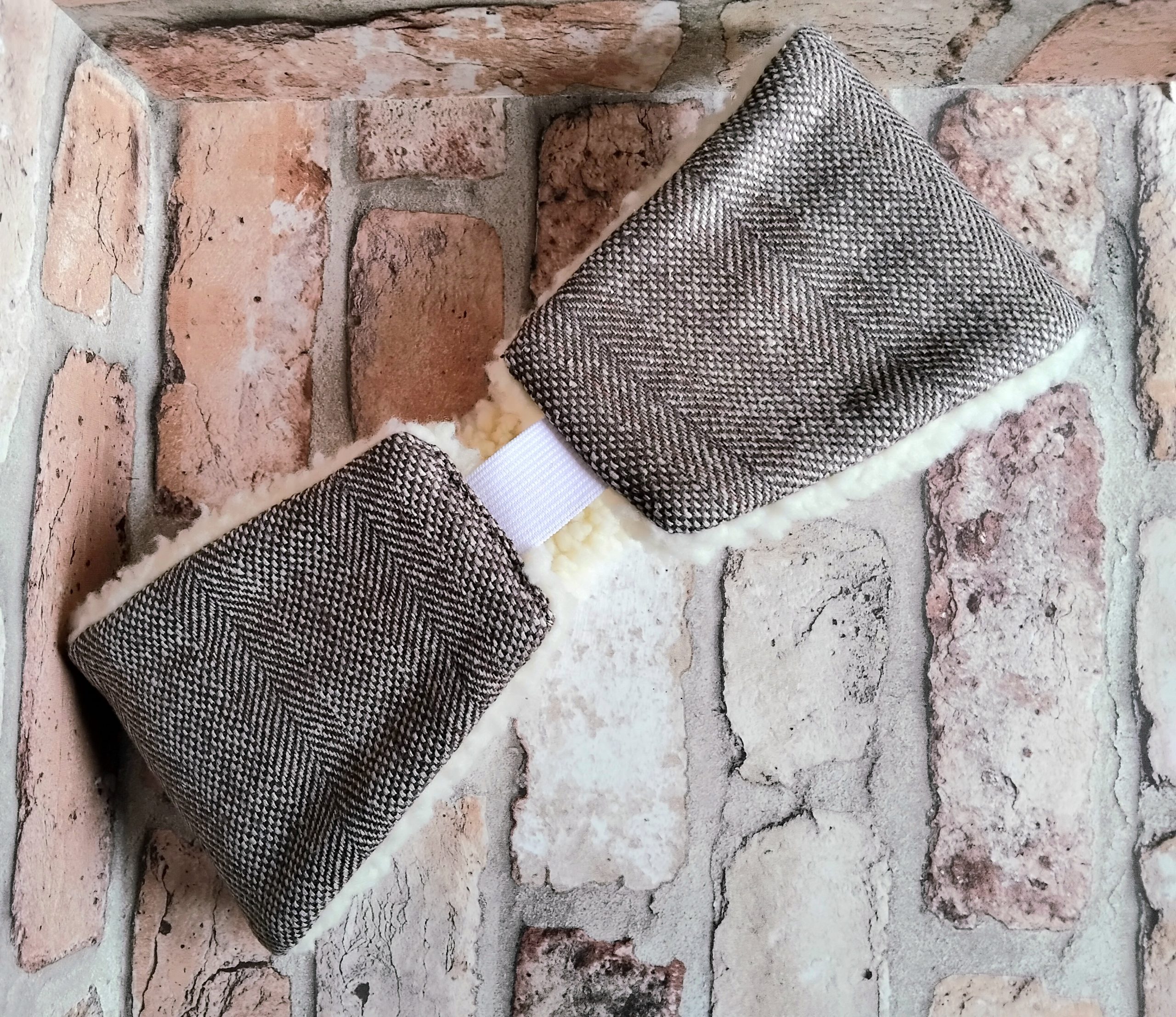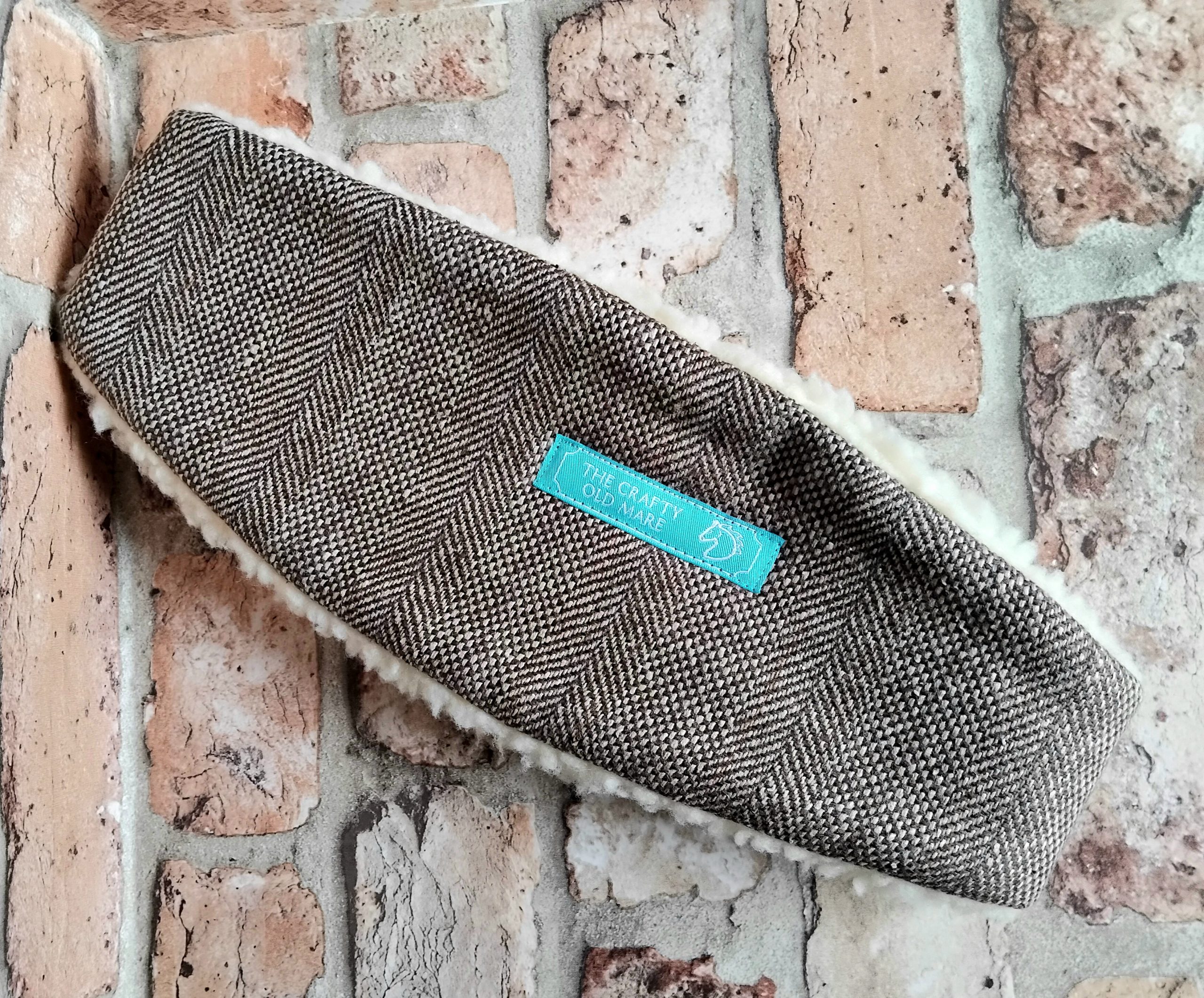 Brown Herringbone Tweed Headband with a Fox printed linen panel. Made from brown and cream wool blend tweed. Lined with cosy cream coloured sherpa fleece. Elasticated back for comfort and fit; white coloured elastic. Size M/L or 57-58cm. Hand-wash only at a cool temperature, do not wring out or iron. Tweed – wool blend. Print – linen. Lining – synthetic.