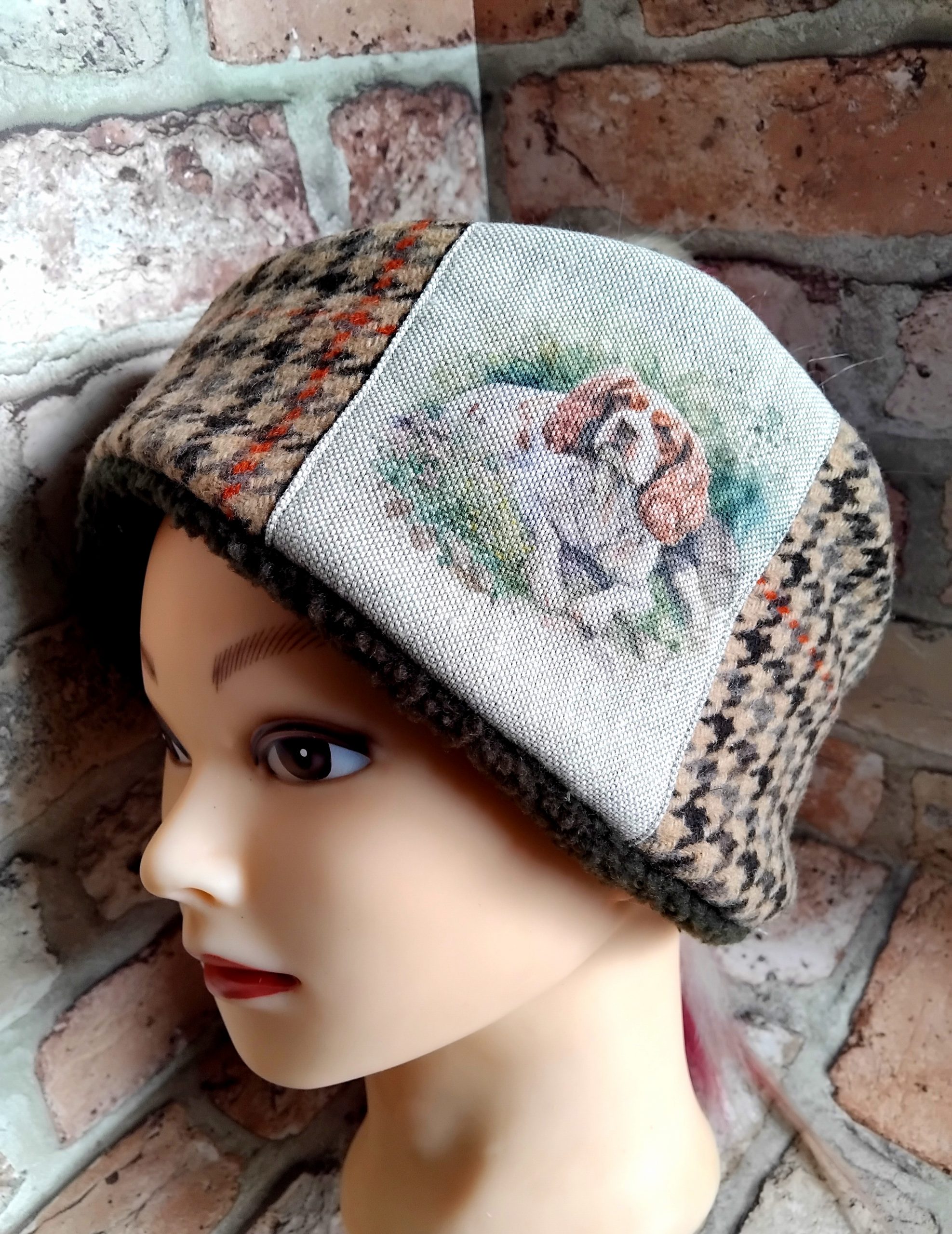 Beige Houndstooth Checked Wool Ear-warmer with Spaniel printed detail; size M/L.