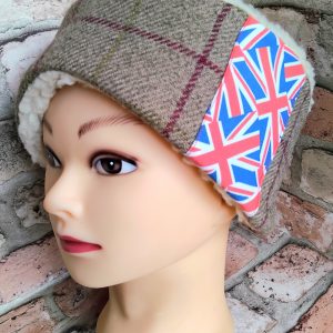 Hounds-tooth Checked Wool-blend Ear-warmer with a liver and white Spaniel printed linen panel. Made from soft beige/dark grey/red checked brushed wool mix fabric. Lined with cosy khaki coloured sherpa fleece. Elasticated back for comfort and fit. Black coloured elastic. Size M/L or 57-58cm. Branded with an embroidered TCOM label. Hand-wash only; do not wring out or iron. Outer – wool-mix. Panel – linen. Lining – synthetic.