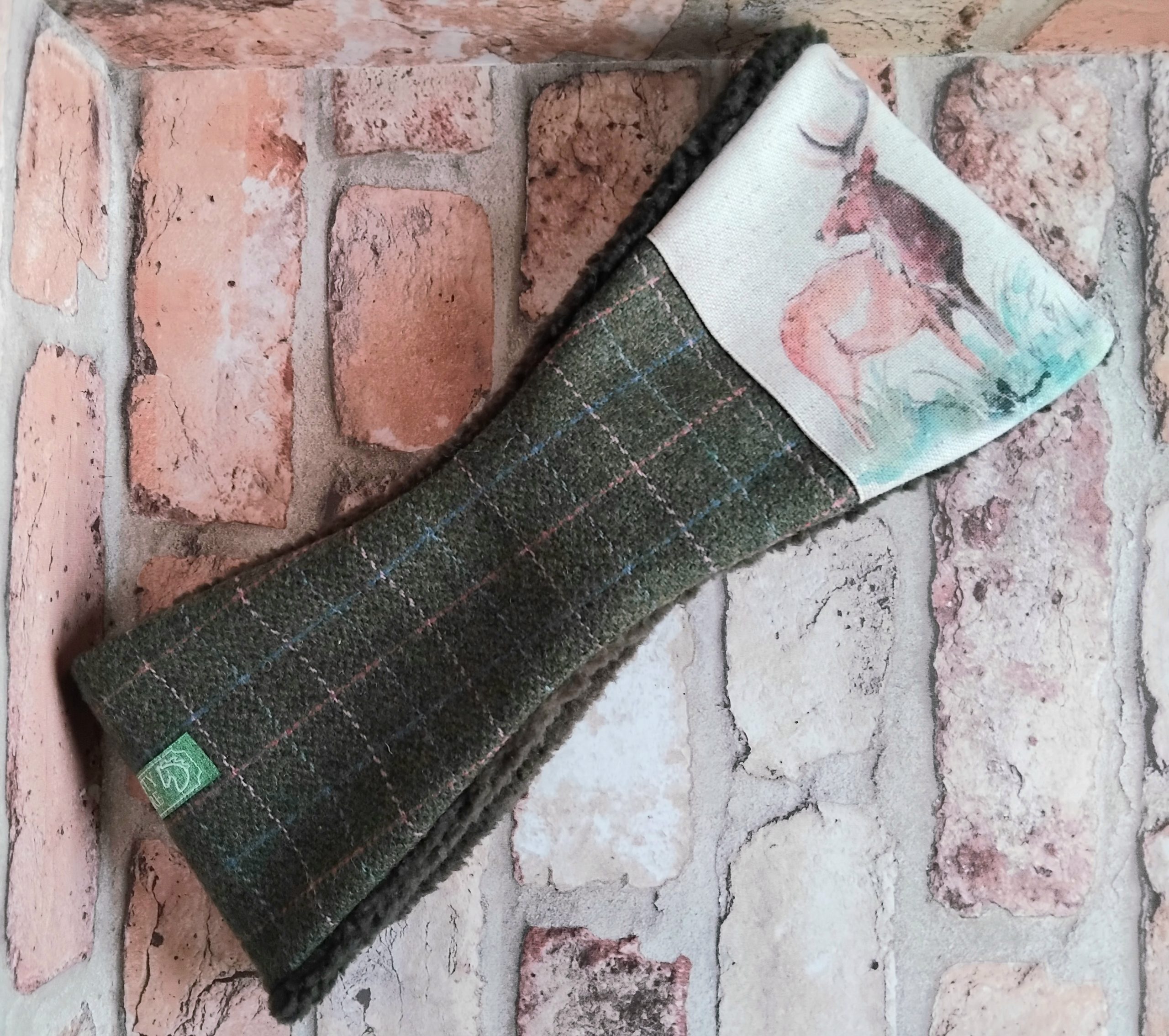 Hunter Green Checked Tweed Ear-warmer with Stag printed detail; size M/L.