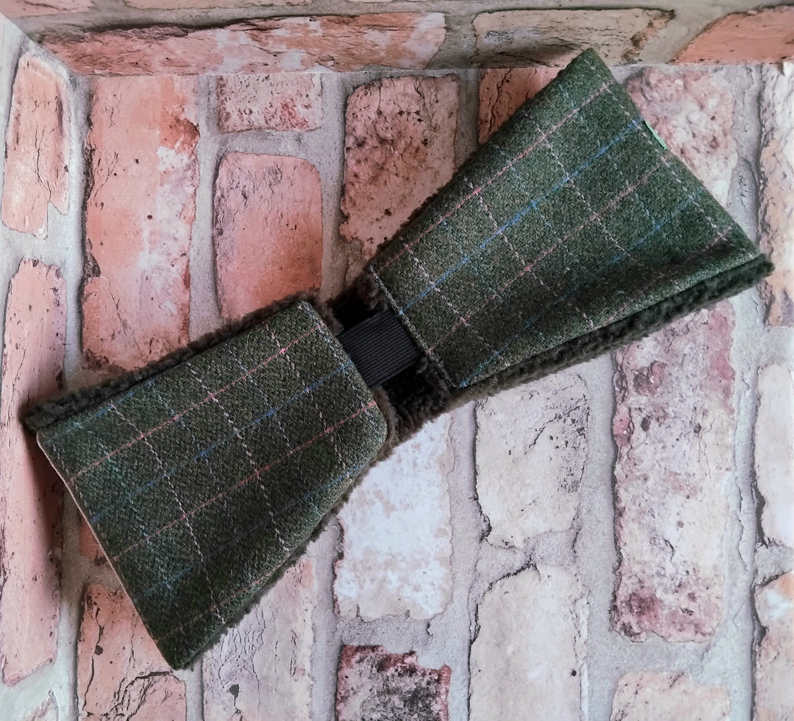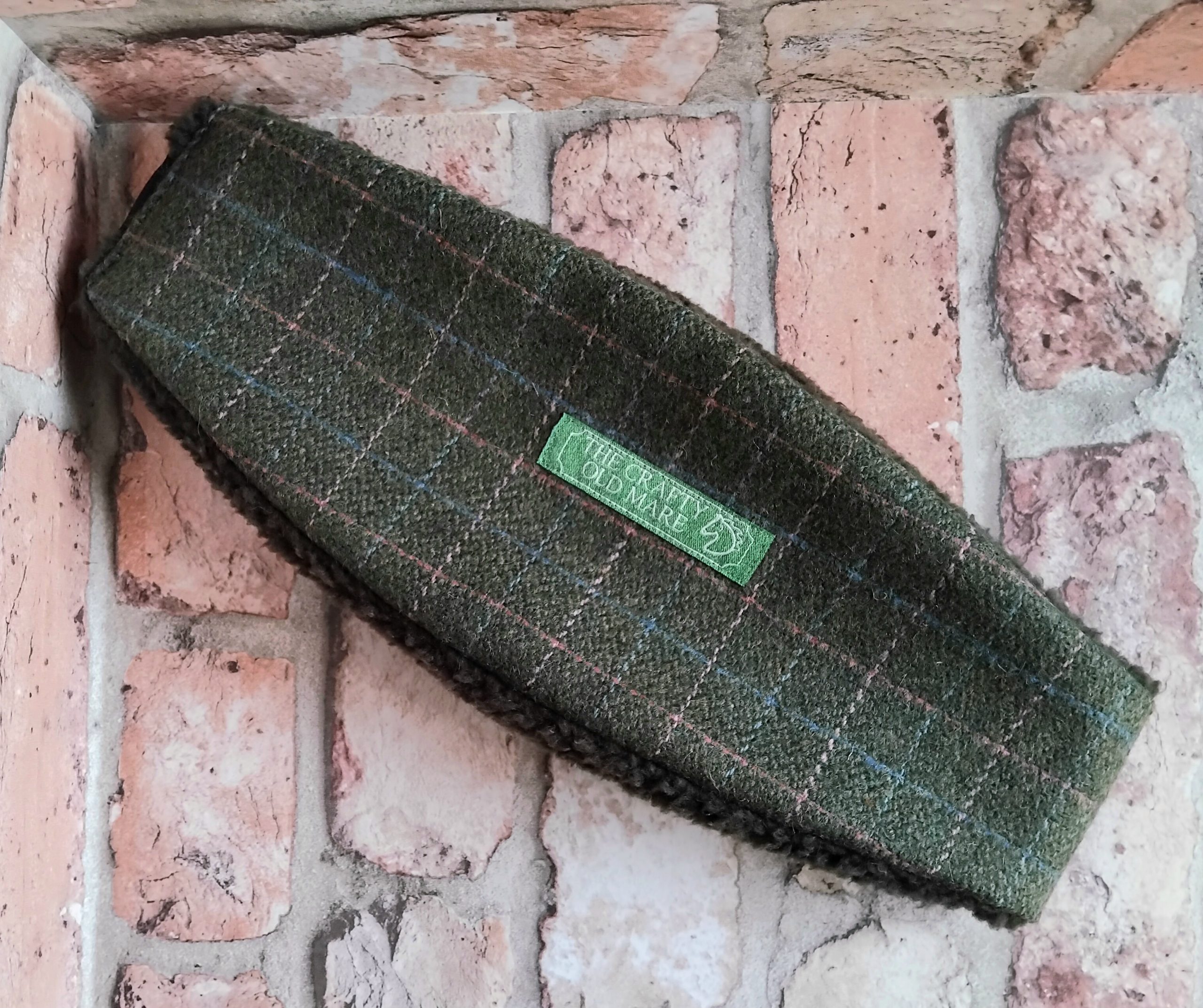 Hunter Green Checked Tweed Wool-blend Ear-warmer with Stag printed linen detail. Made from hunter green tweed with a pink and pale blue subtle check. Lined with cosy khaki coloured sherpa fleece. Elasticated back for comfort and fit. Black coloured elastic. Size M/L or 57-58cm head. Branded with an embroidered TCOM label. Hand-wash only; do not wring out or iron. Outer – wool-mix. Panel – linen. Lining – synthetic.