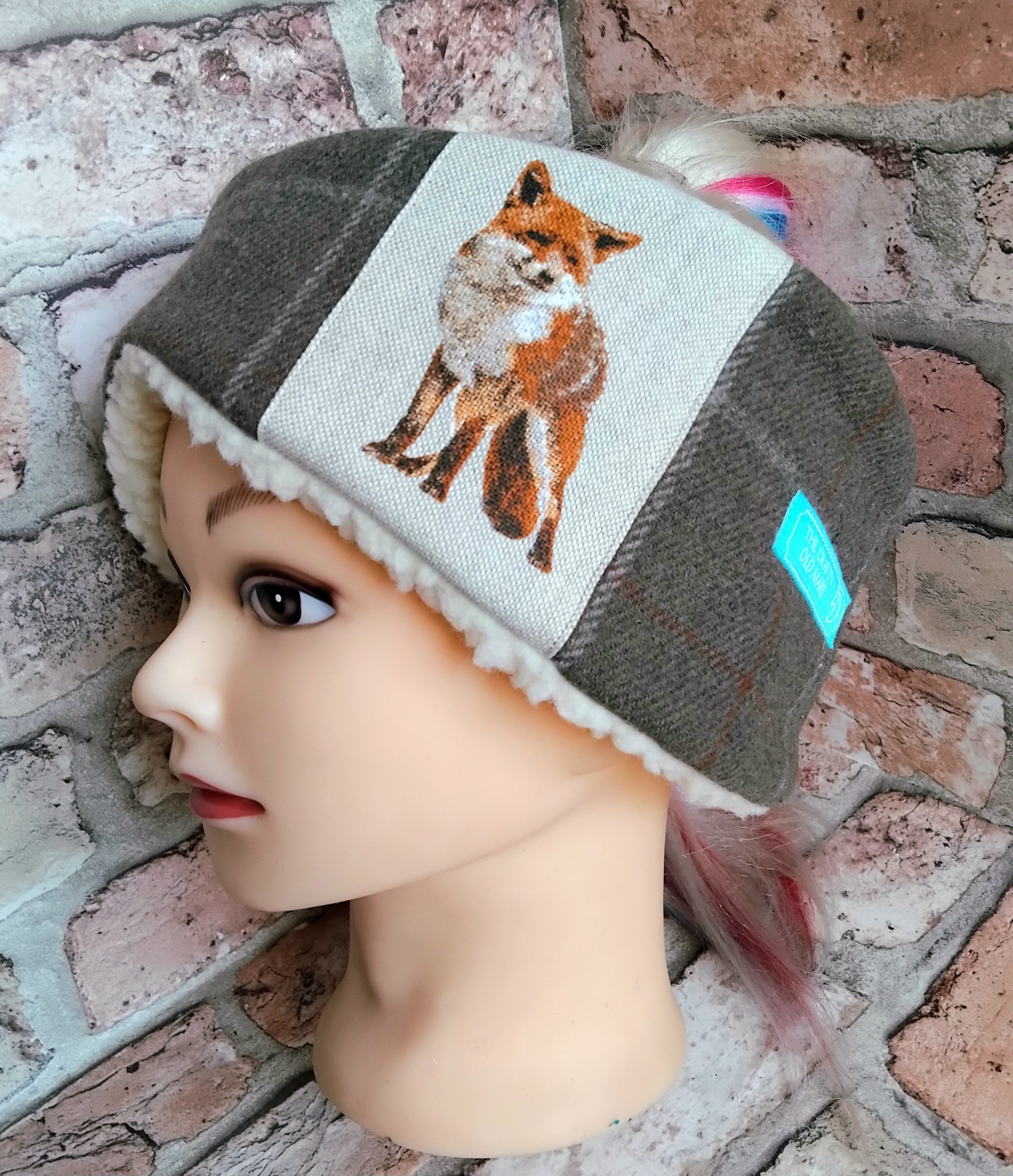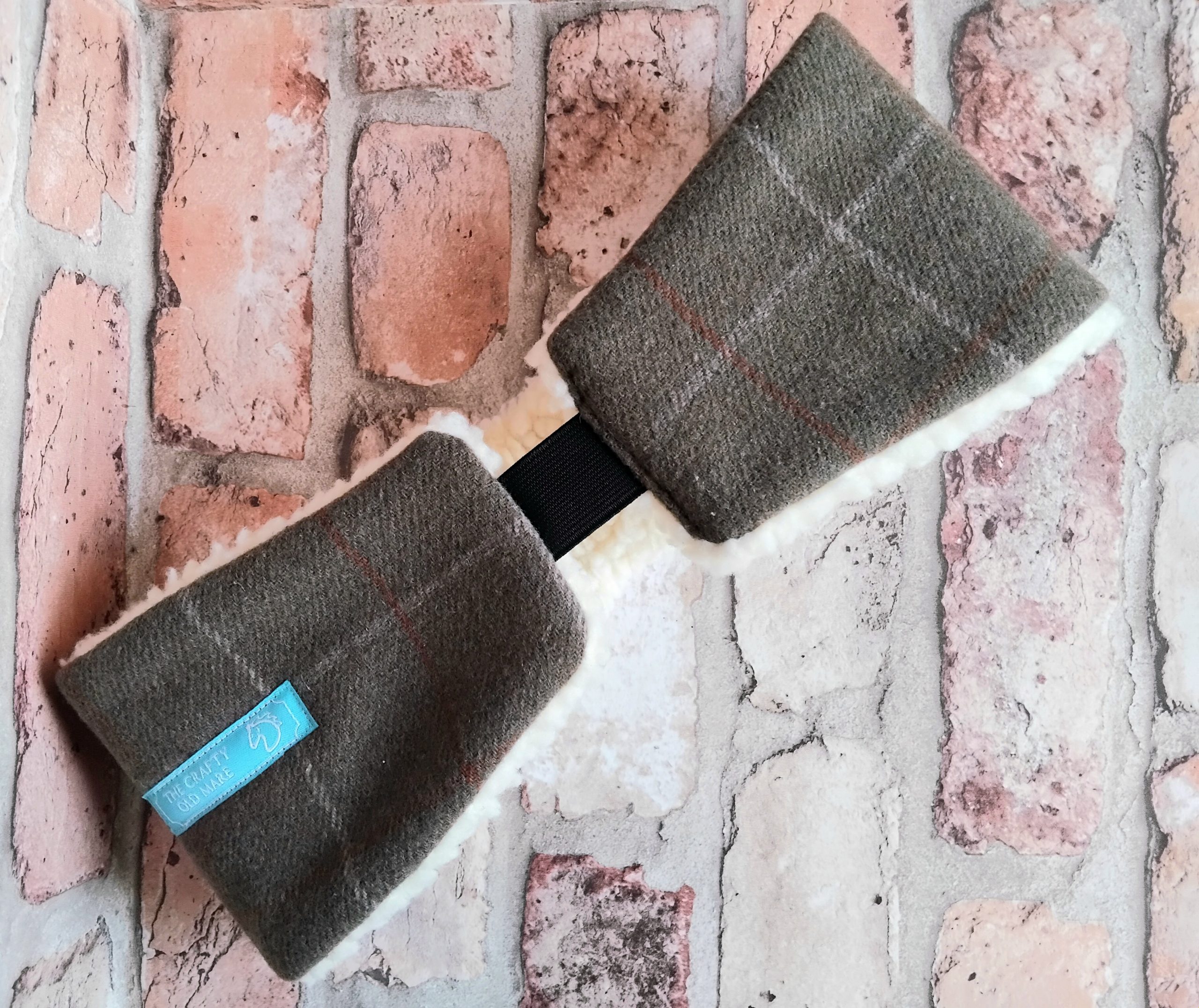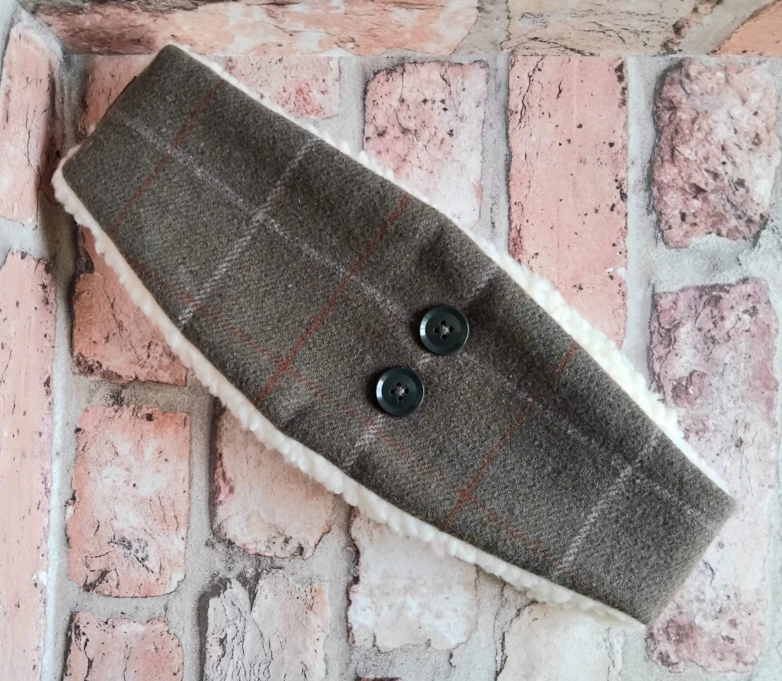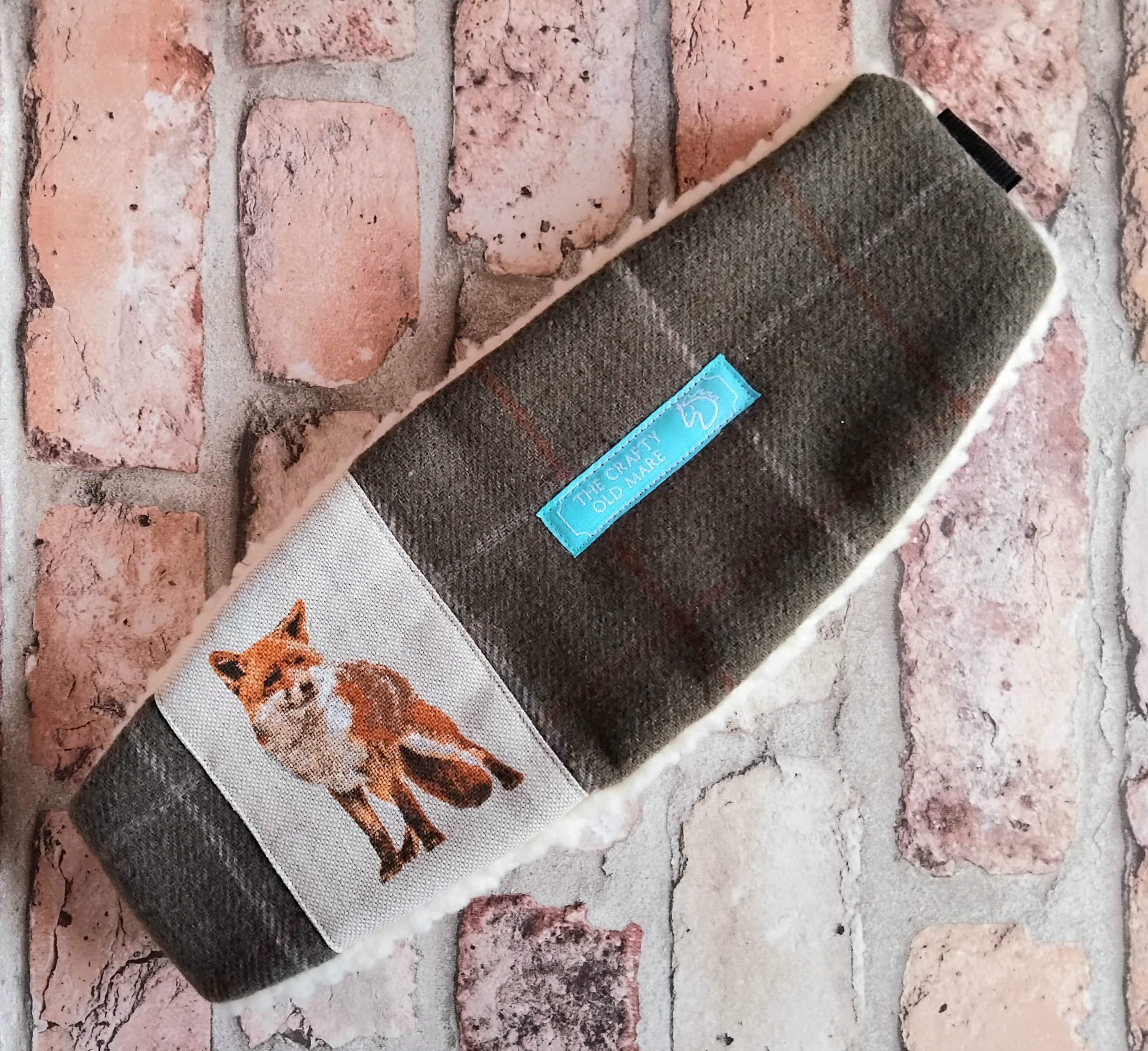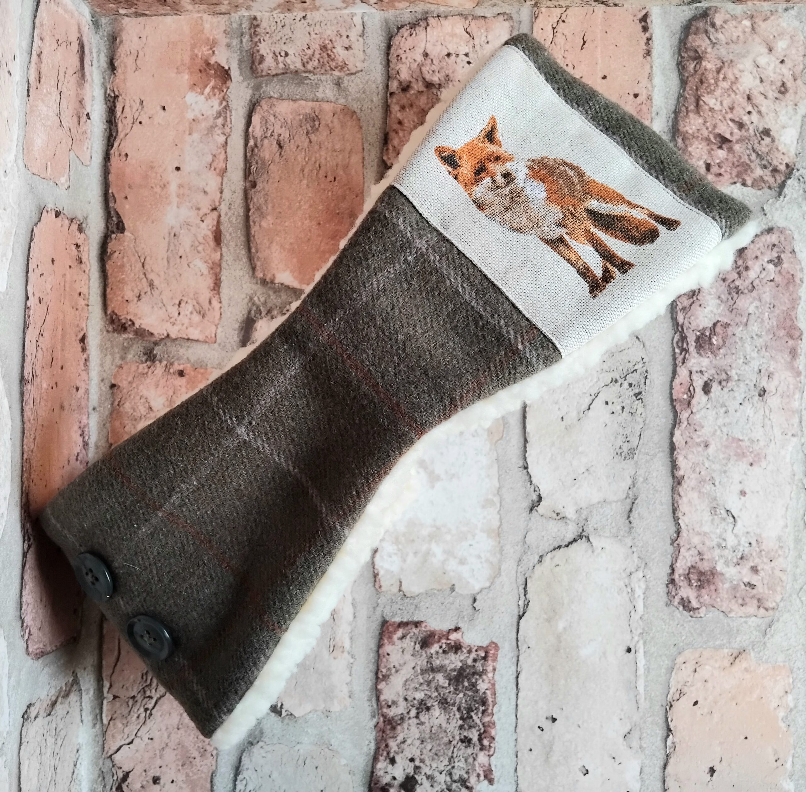 Olive Tweed Checked Headband with a Fox printed linen panel and double button detail (on opposite side to fox panel). Made from olive wool-mix tweed with a subtle cream and ginger check. Lined with cosy cream coloured luxury sherpa fleece. Elasticated back for comfort and fit. Black coloured elastic. Size M/L or 57-58cm. Branded with an embroidered TCOM label. Hand-wash only; do not wring out or iron. Outer – wool-mix. Panel – linen. Lining – synthetic. Buttons – plastic.