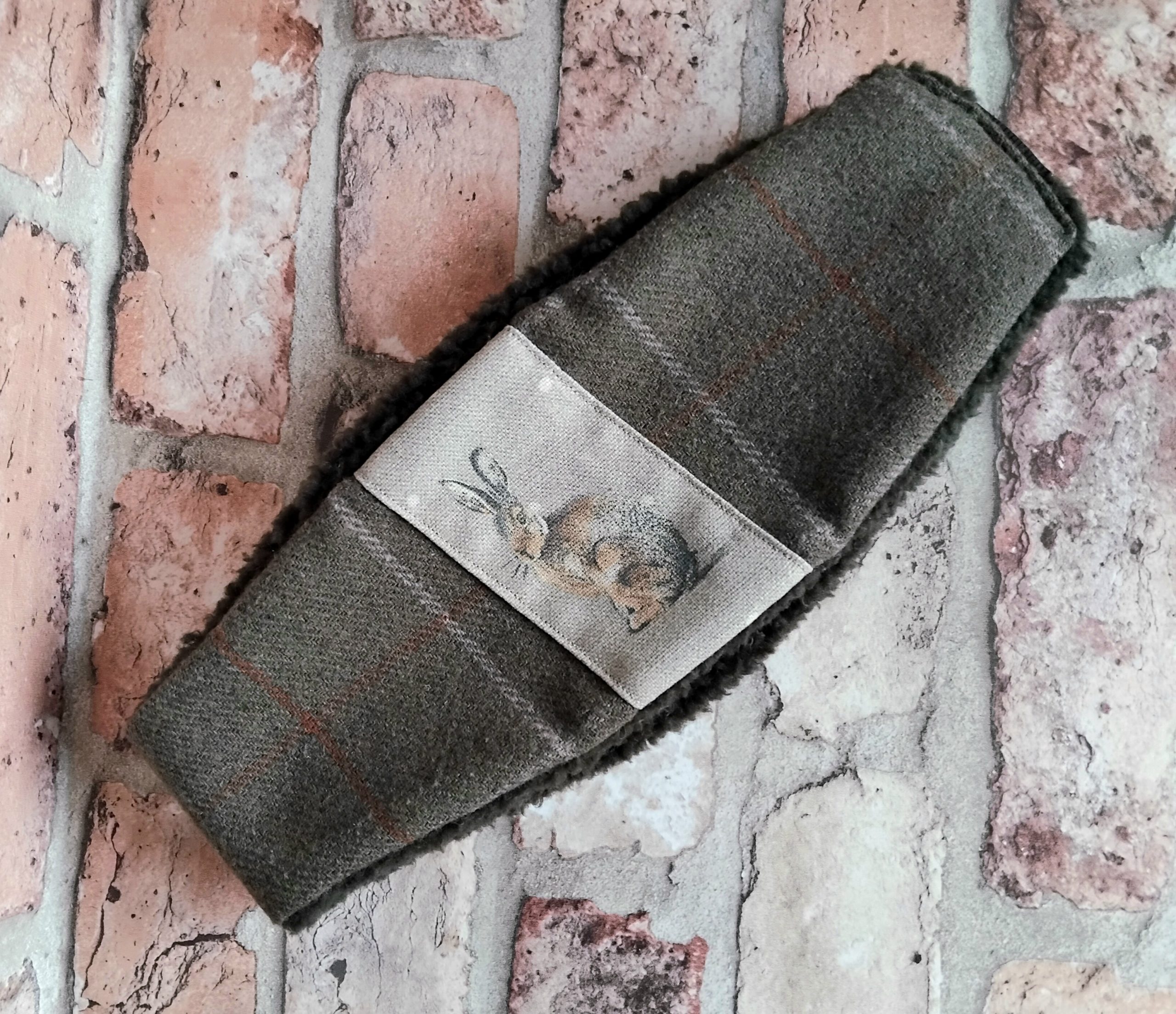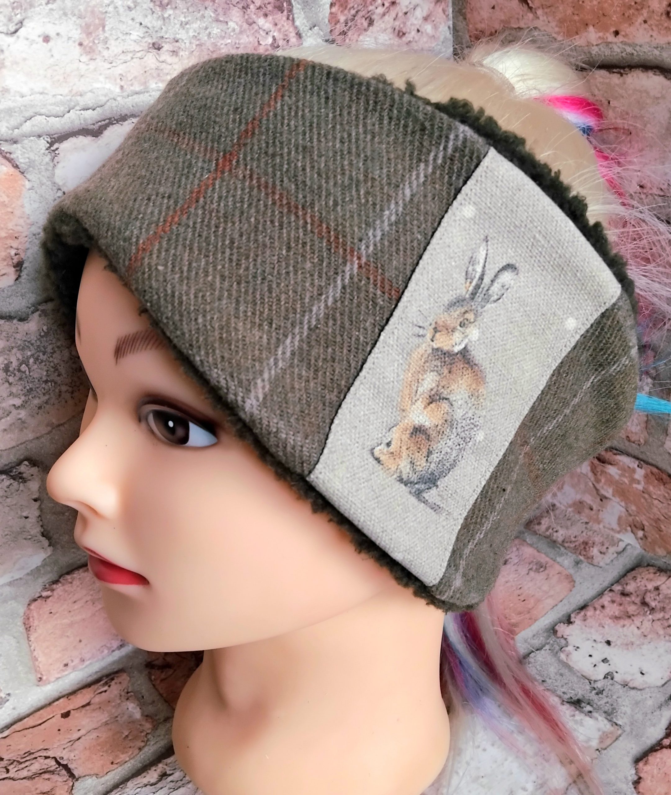 Olive Tweed Checked Wool Ear-warmer with Hare print detail; size S.