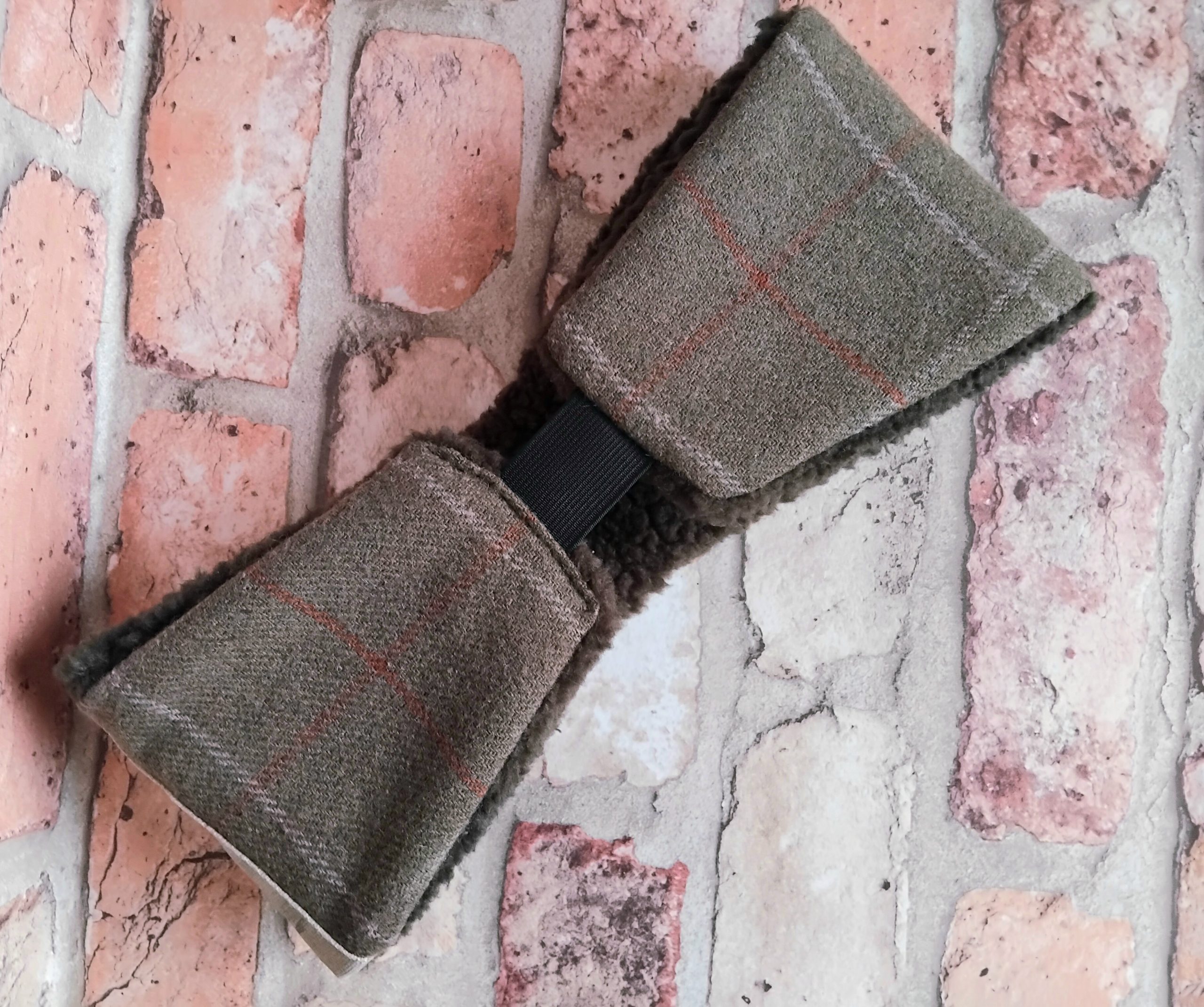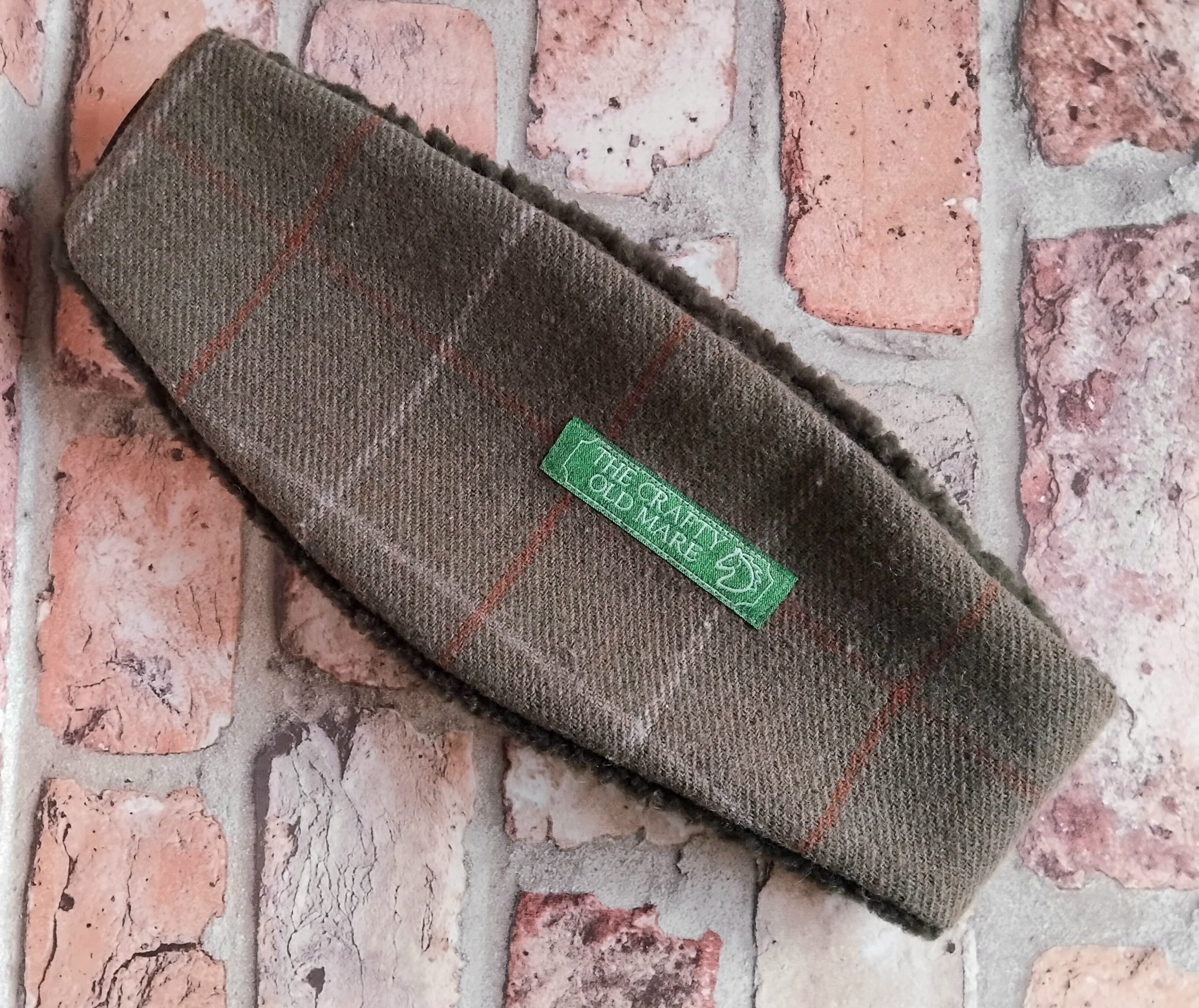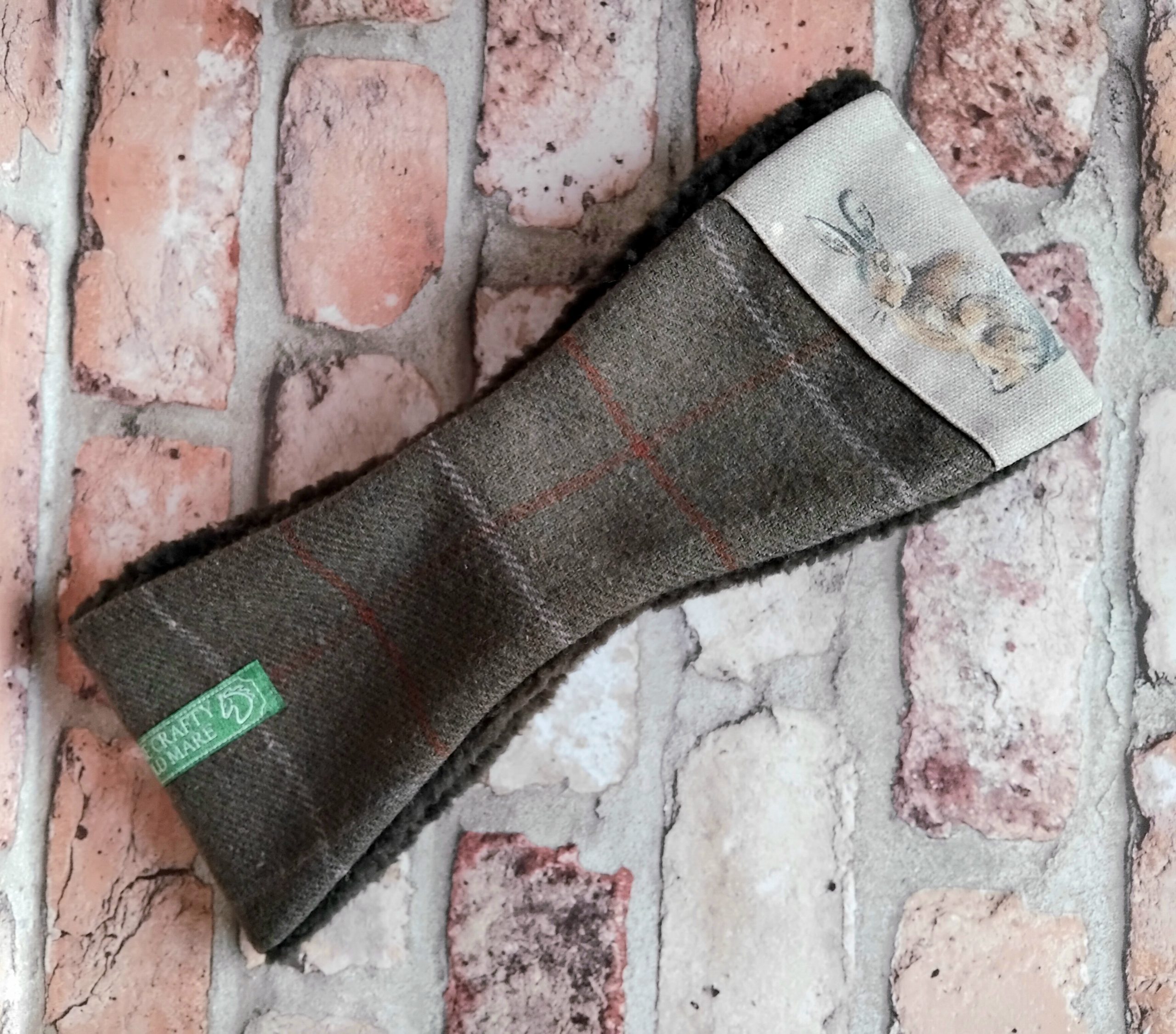 Olive tweed Checked Wool-blend Ear-warmer with Hare printed detail. Made from olive wool-mix tweed with a subtle cream and ginger check. Lined with cosy khaki coloured sherpa fleece. Elasticated back for comfort and fit. Black coloured elastic. Size S or 54cm head. Branded with an embroidered TCOM label. Hand-wash only; do not wring out or iron. Outer – wool-mix. Panel – cotton. Lining – synthetic.