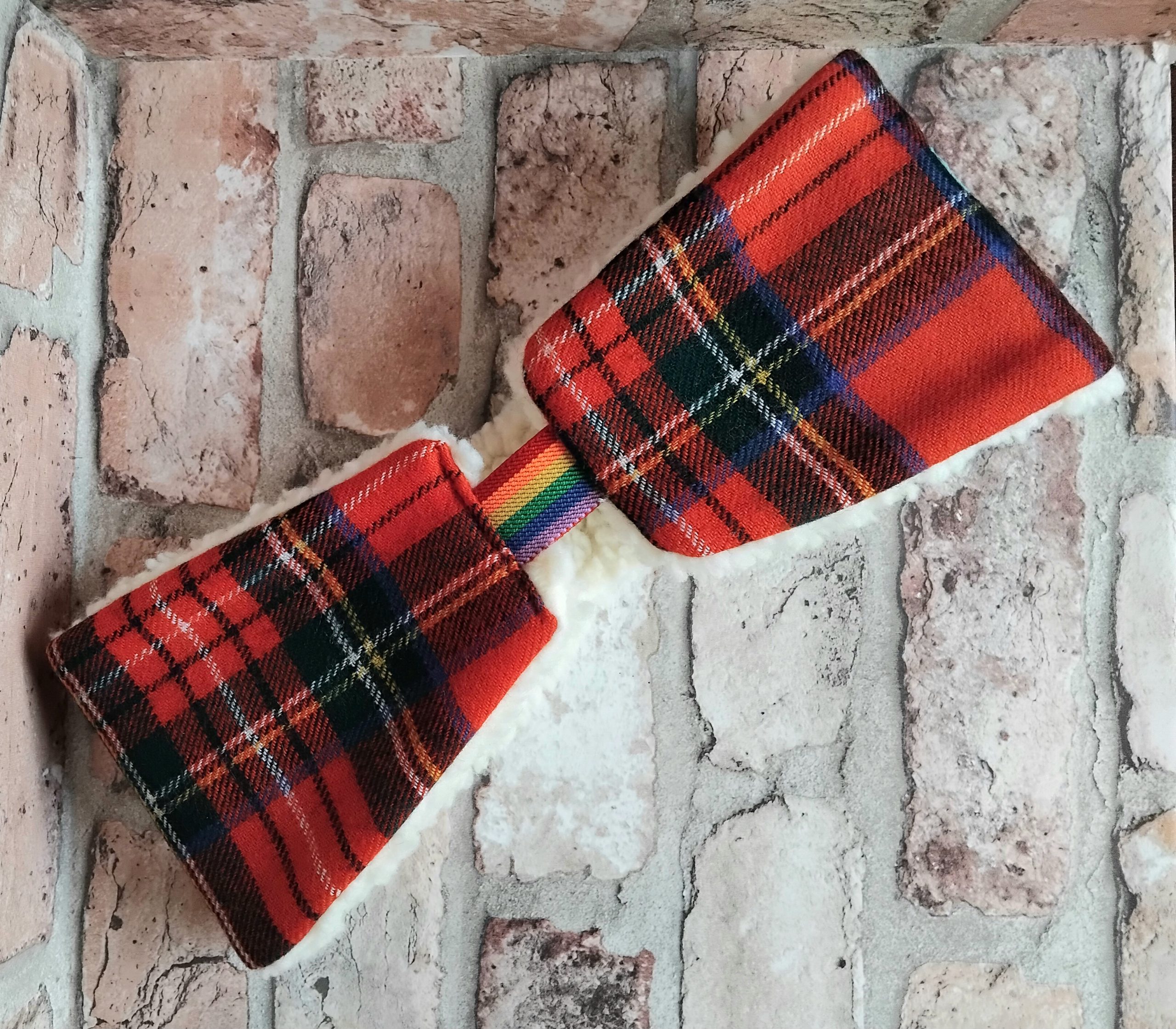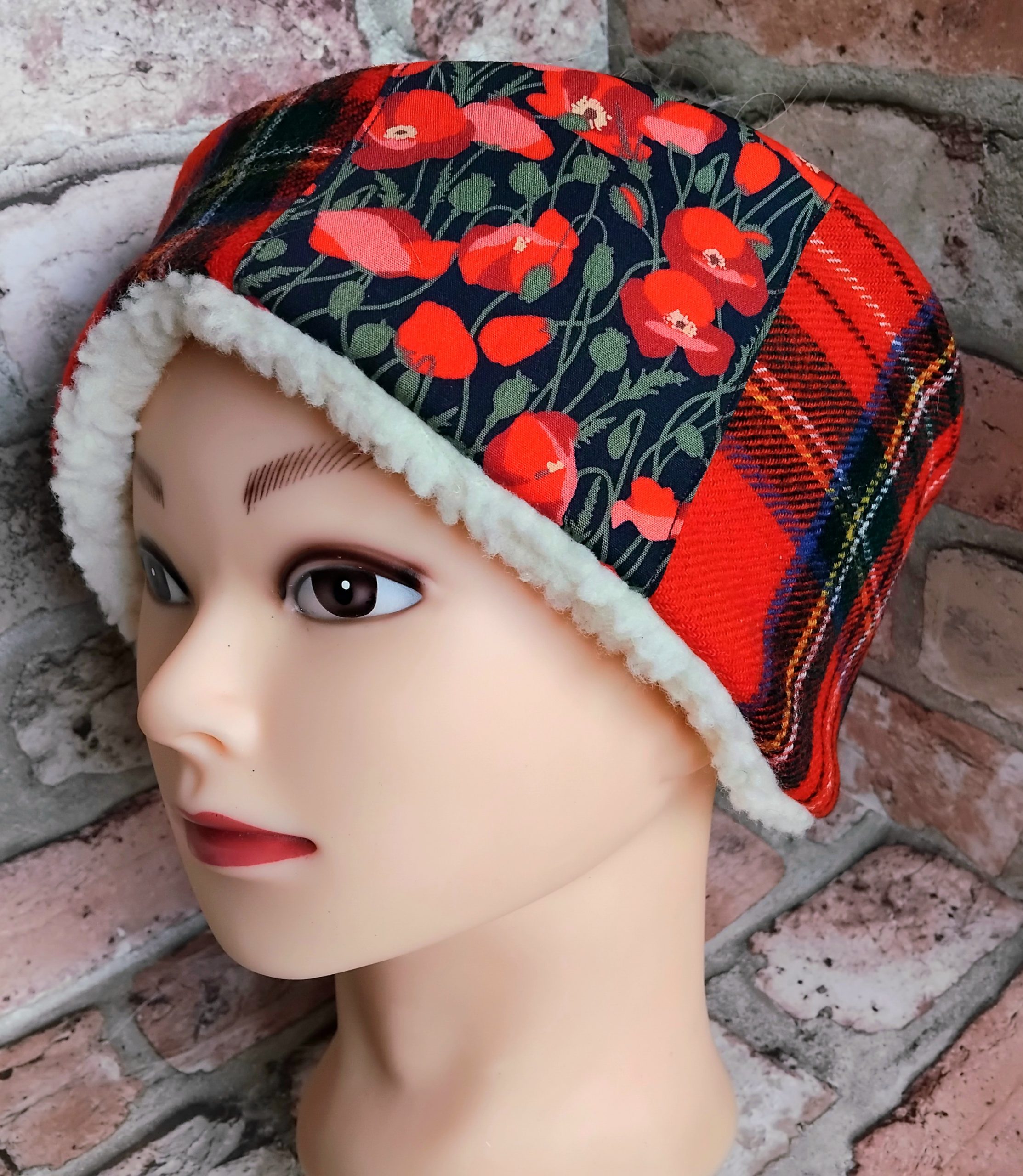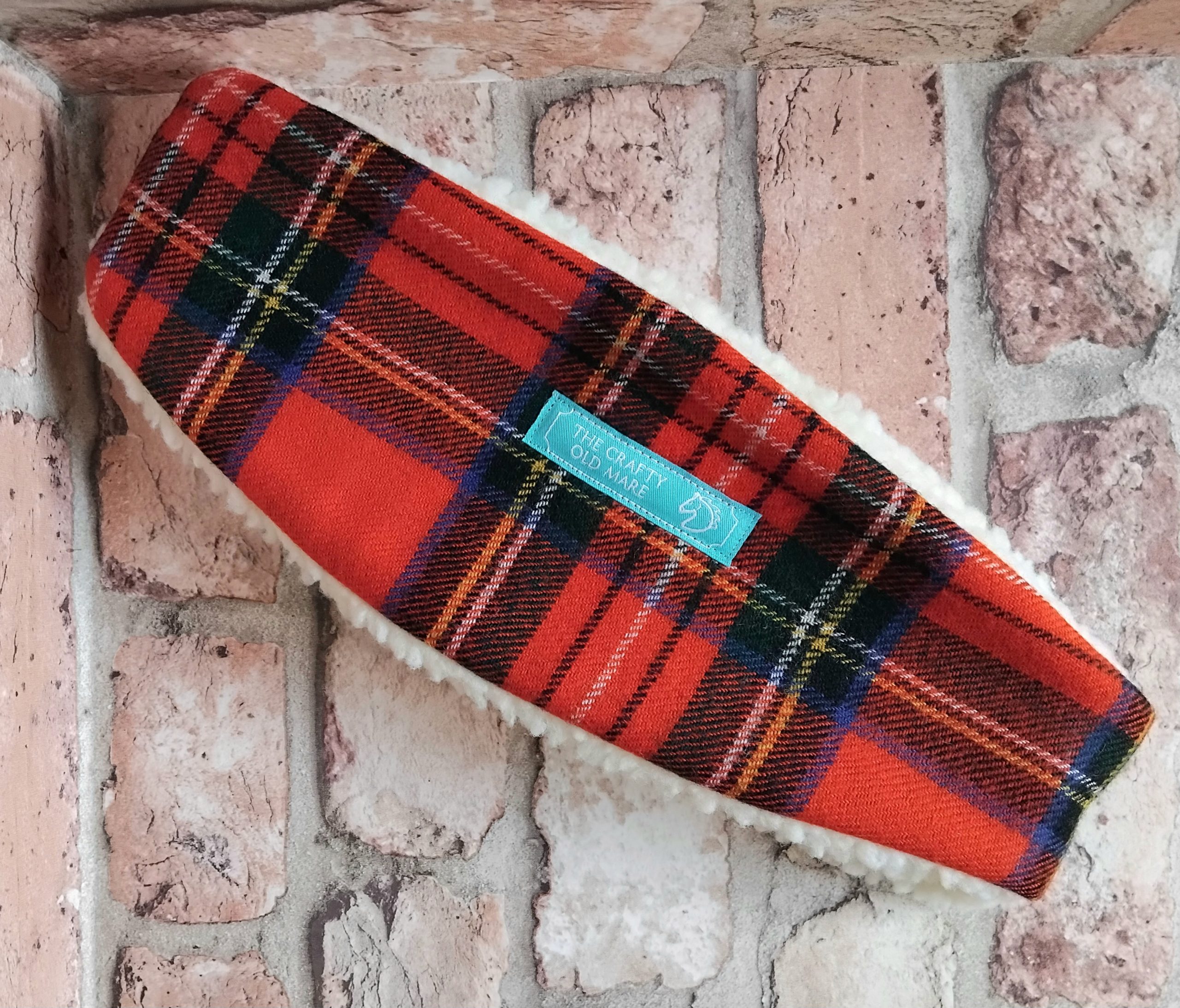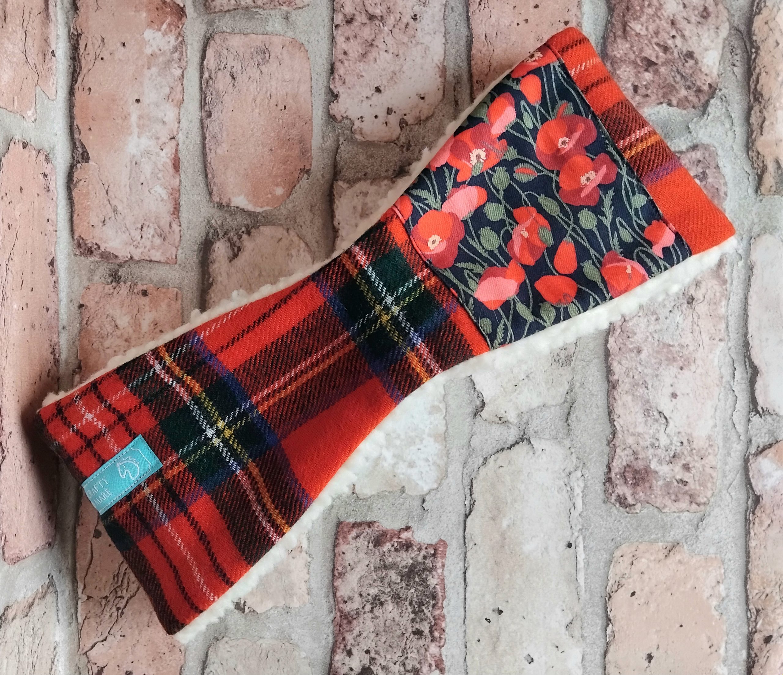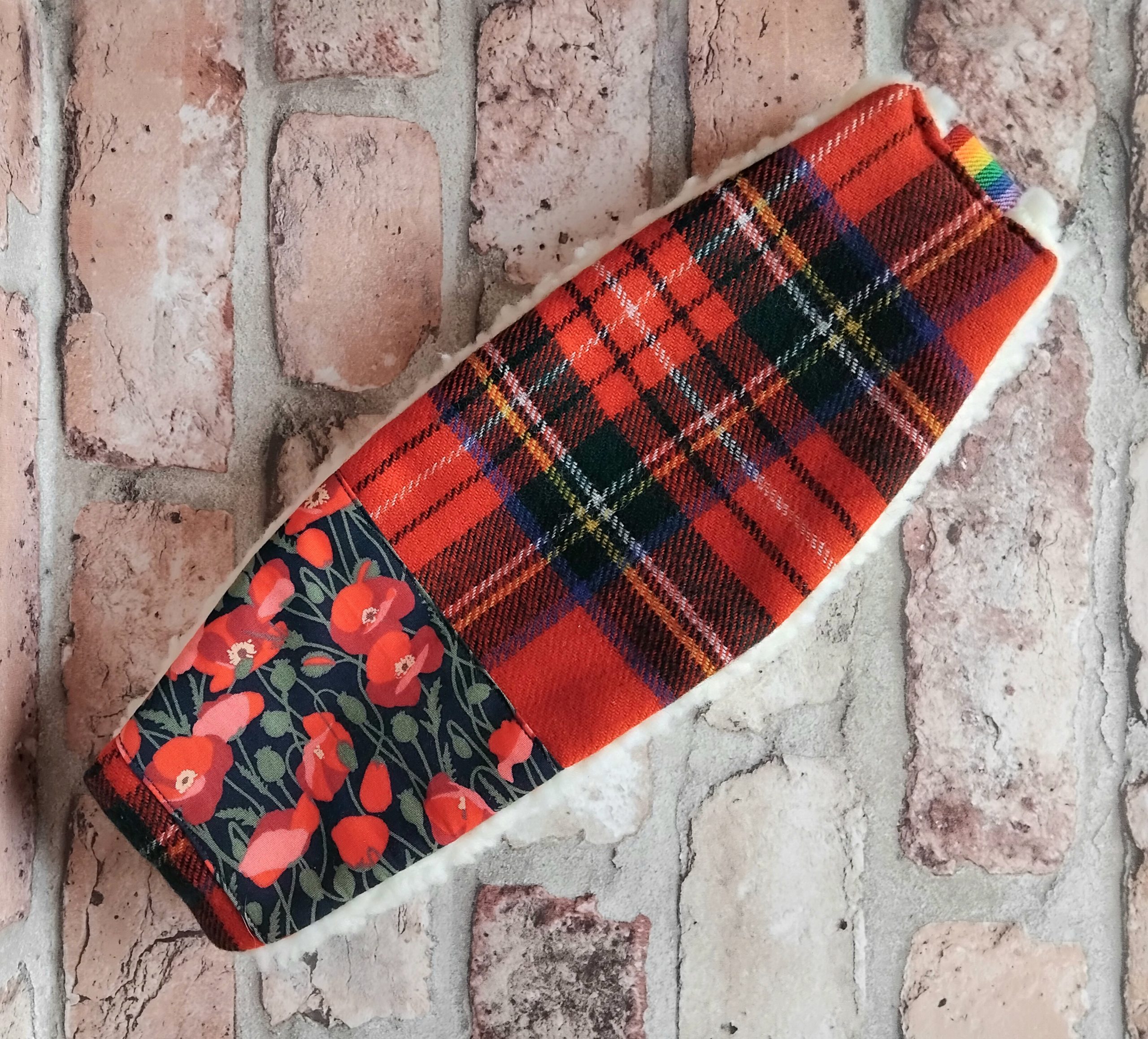 Red Tartan Checked Fabric Headband with a pretty Poppy printed cotton panel. Made from quality red checked Tartan blended wool fabric. Predominant colour is red. Lined with cosy cream coloured sherpa fleece. Elasticated back for comfort and fit; rainbow coloured elastic. Size M/L or 57-58cm. Branded with an embroidered TCOM label. Hand-wash only at a cool temperature, do not wring out or iron. Outer – wool blend. Print – cotton. Fleece – synthetic.