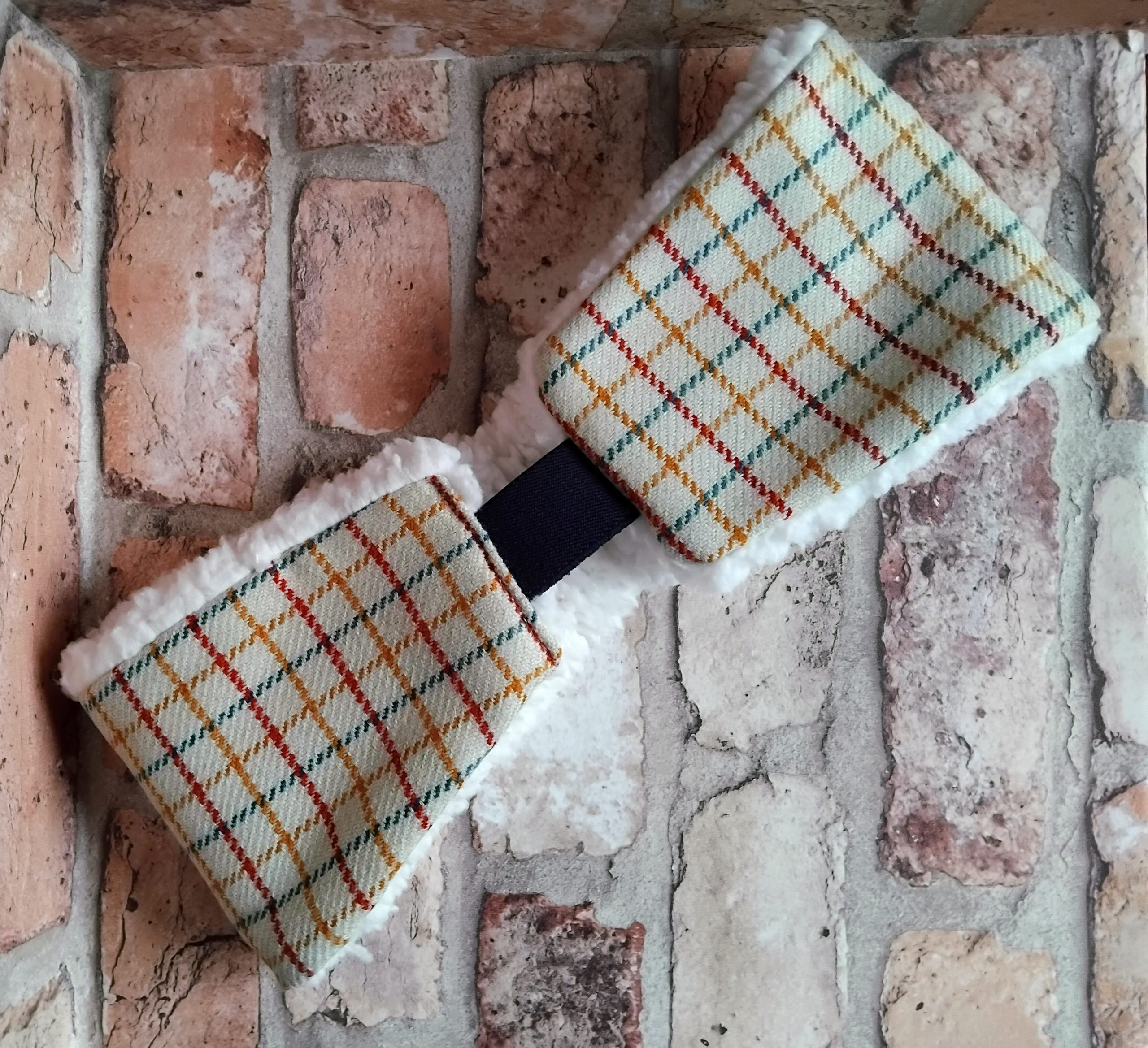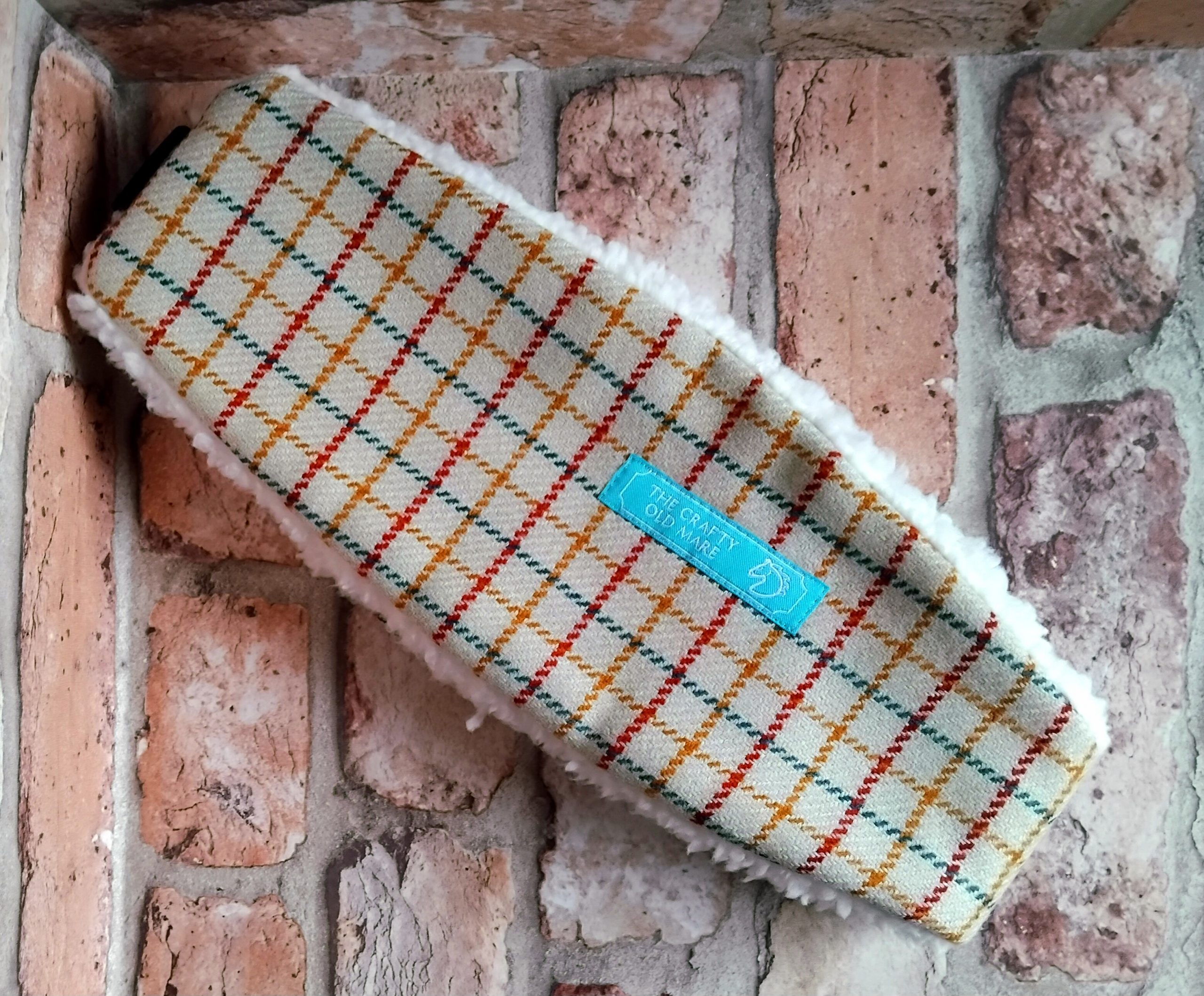 Tattershall Checked Wool-blend Ear-warmer with Pheasant printed linen panel detail. Made from cream based Tattershall checked fabric, with a deep red, dark yellow and blue check. Lined with cosy cream coloured luxury sherpa fleece. Elasticated back for comfort and fit. Black coloured elastic. Size M/L or 57-58cm head. Branded with an embroidered TCOM label. Hand-wash only; do not wring out or iron. Outer – wool-mix. Panel – linen. Lining – synthetic.