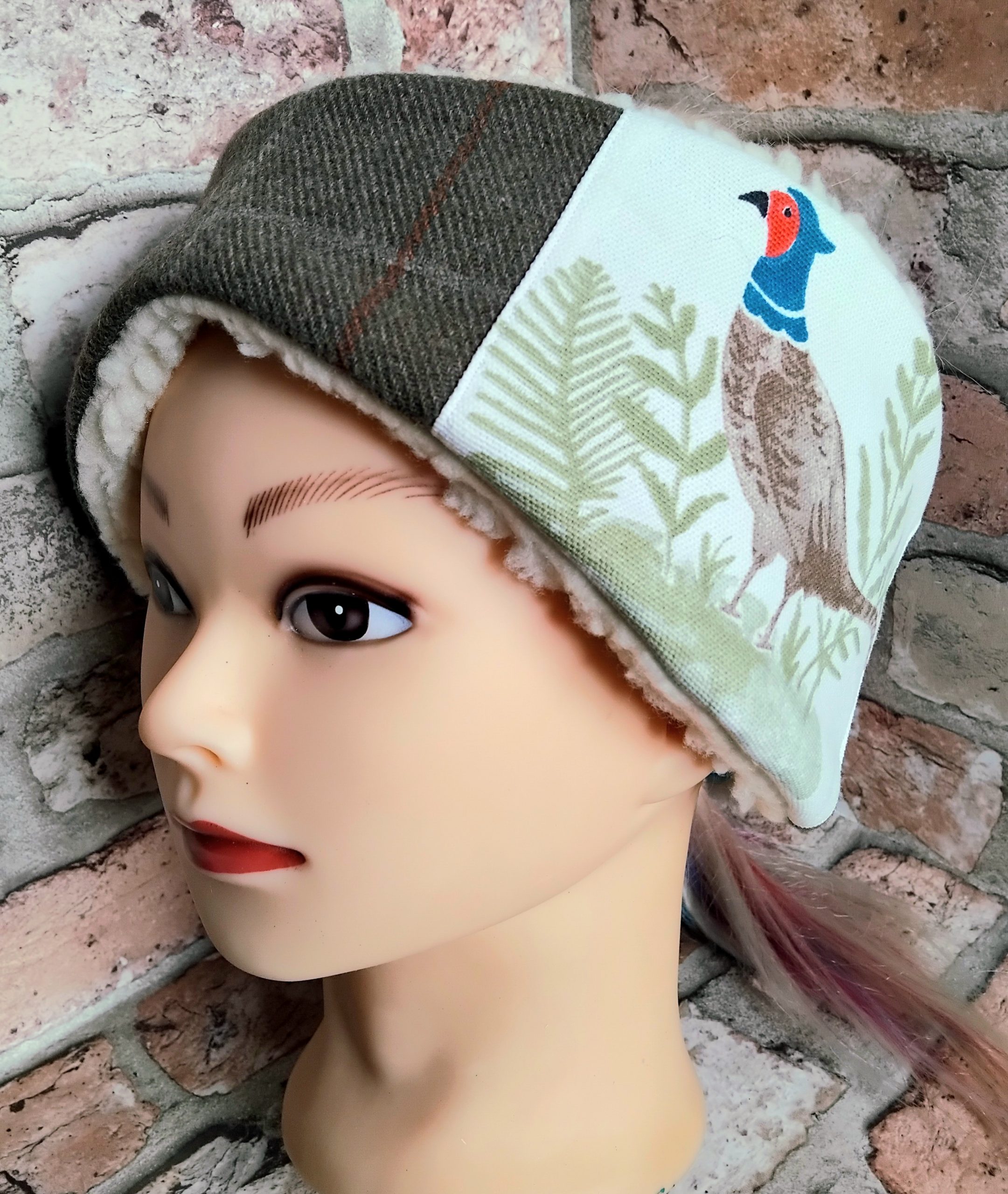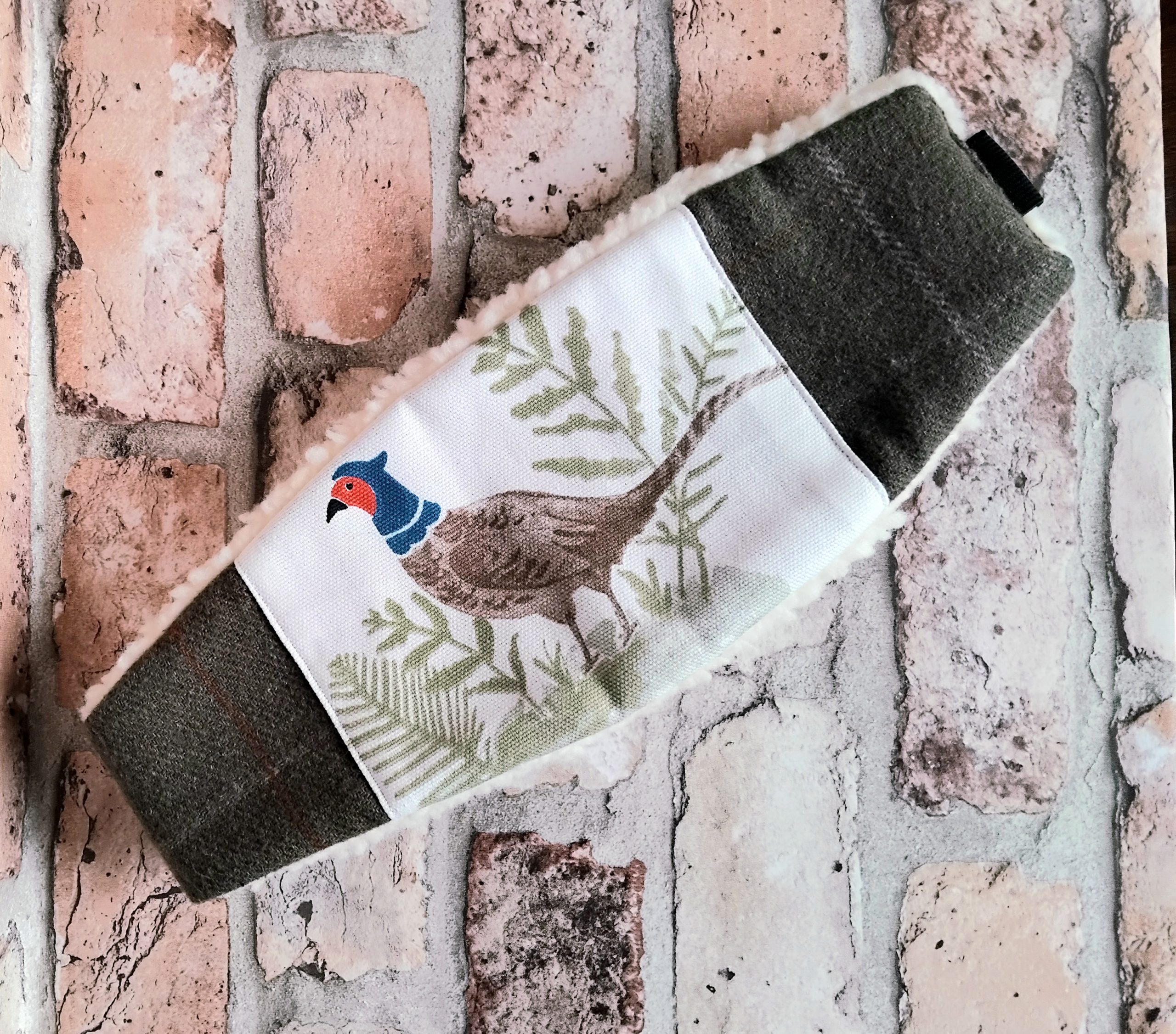Olive Tweed Ear-warmer with Pheasant print detail; size M/L.