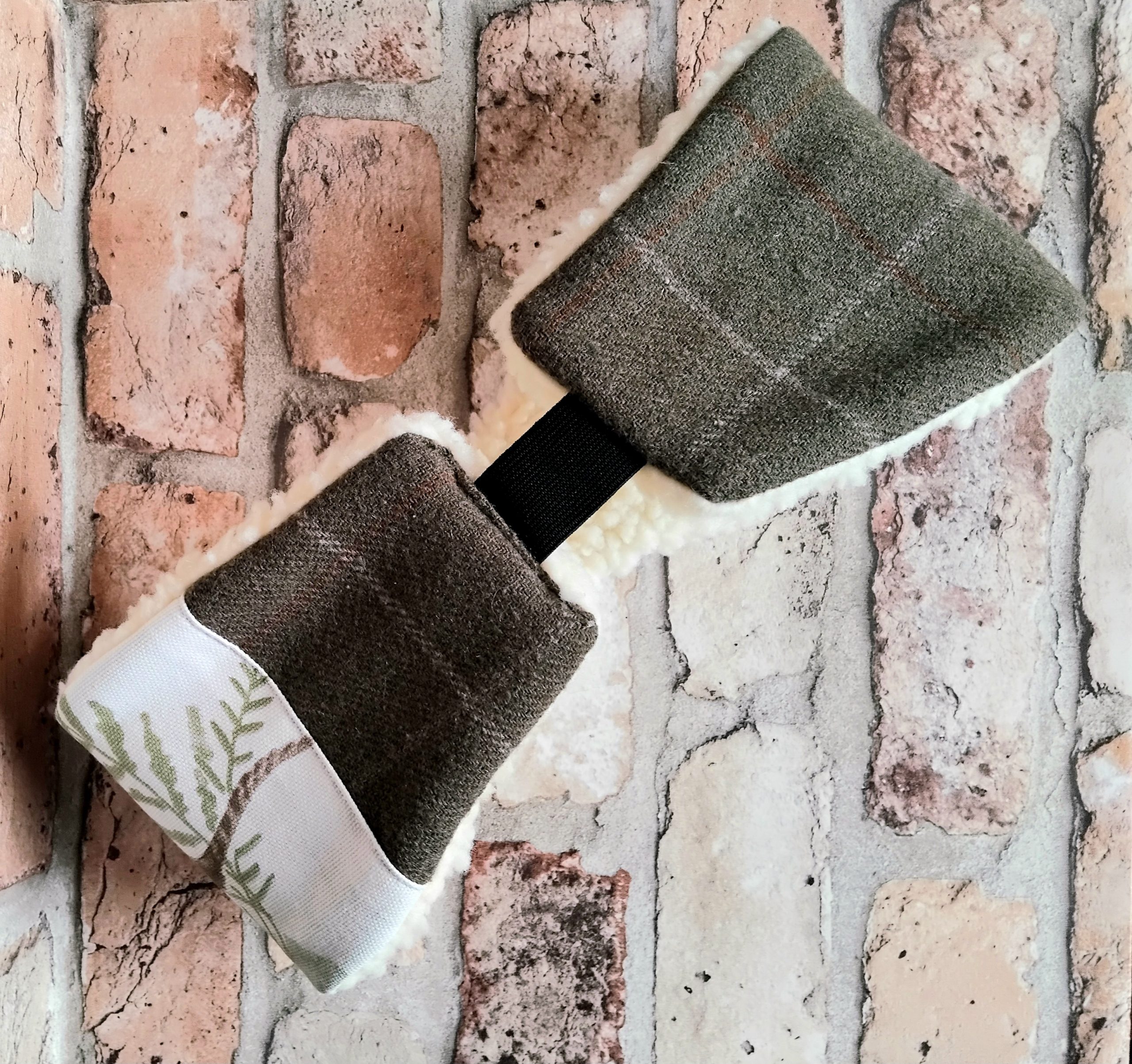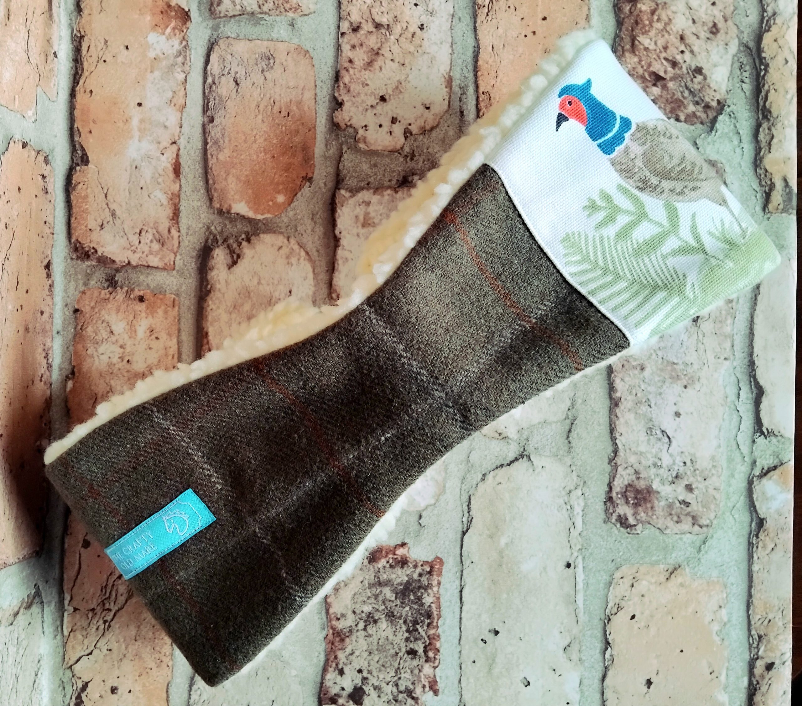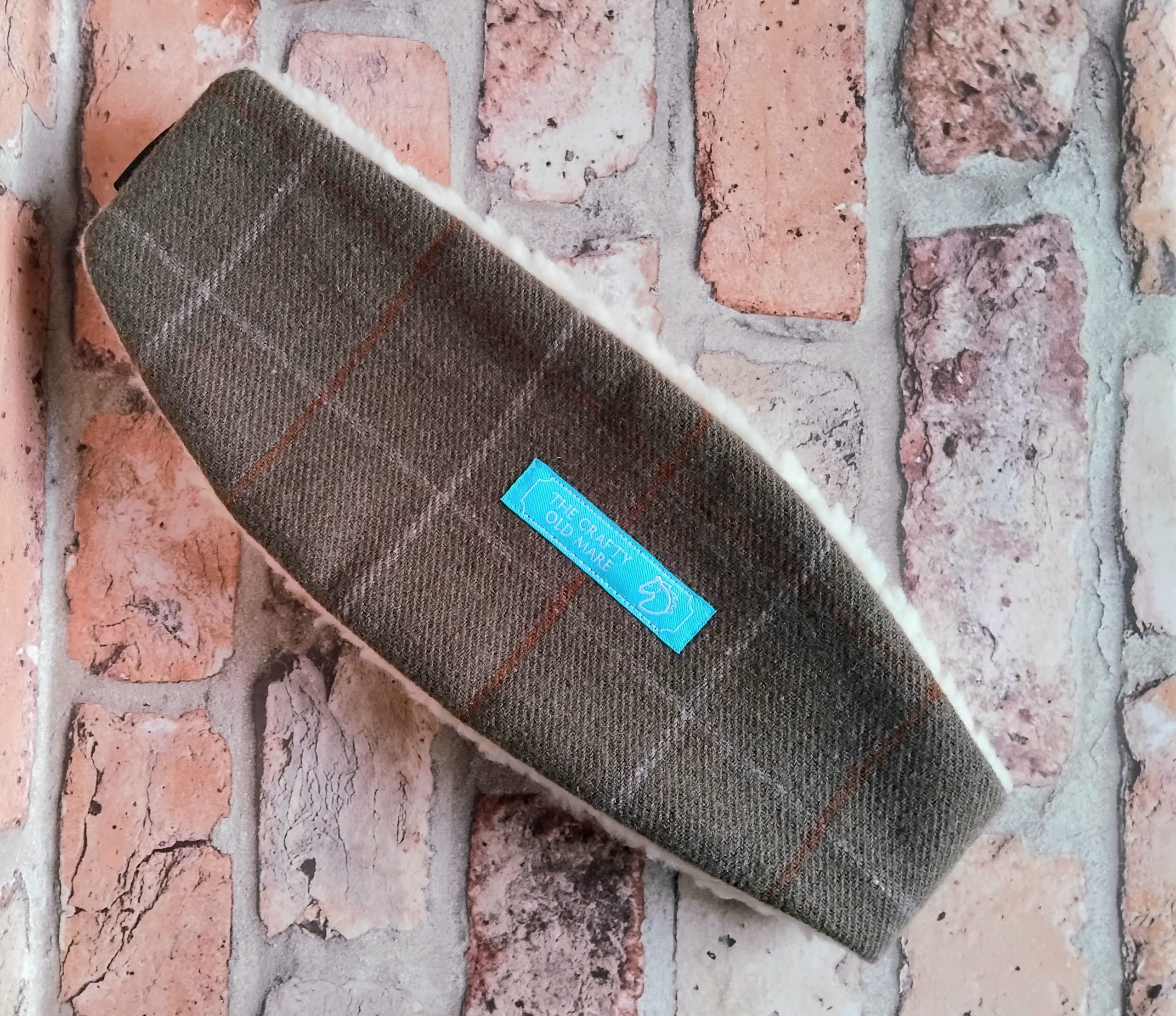 Olive Tweed Checked Ear-warmer with a Pheasant printed cotton panel. Made from olive checked wool-mix tweed with a subtle cream and ginger check. Lined with cosy cream coloured sherpa fleece. Elasticated back for comfort and fit. Black coloured elastic. Size M/L or 57-58cm. Branded with an embroidered TCOM label. Hand-wash only; do not wring out or iron. Outer – wool-mix. Panel – cotton. Lining – synthetic.