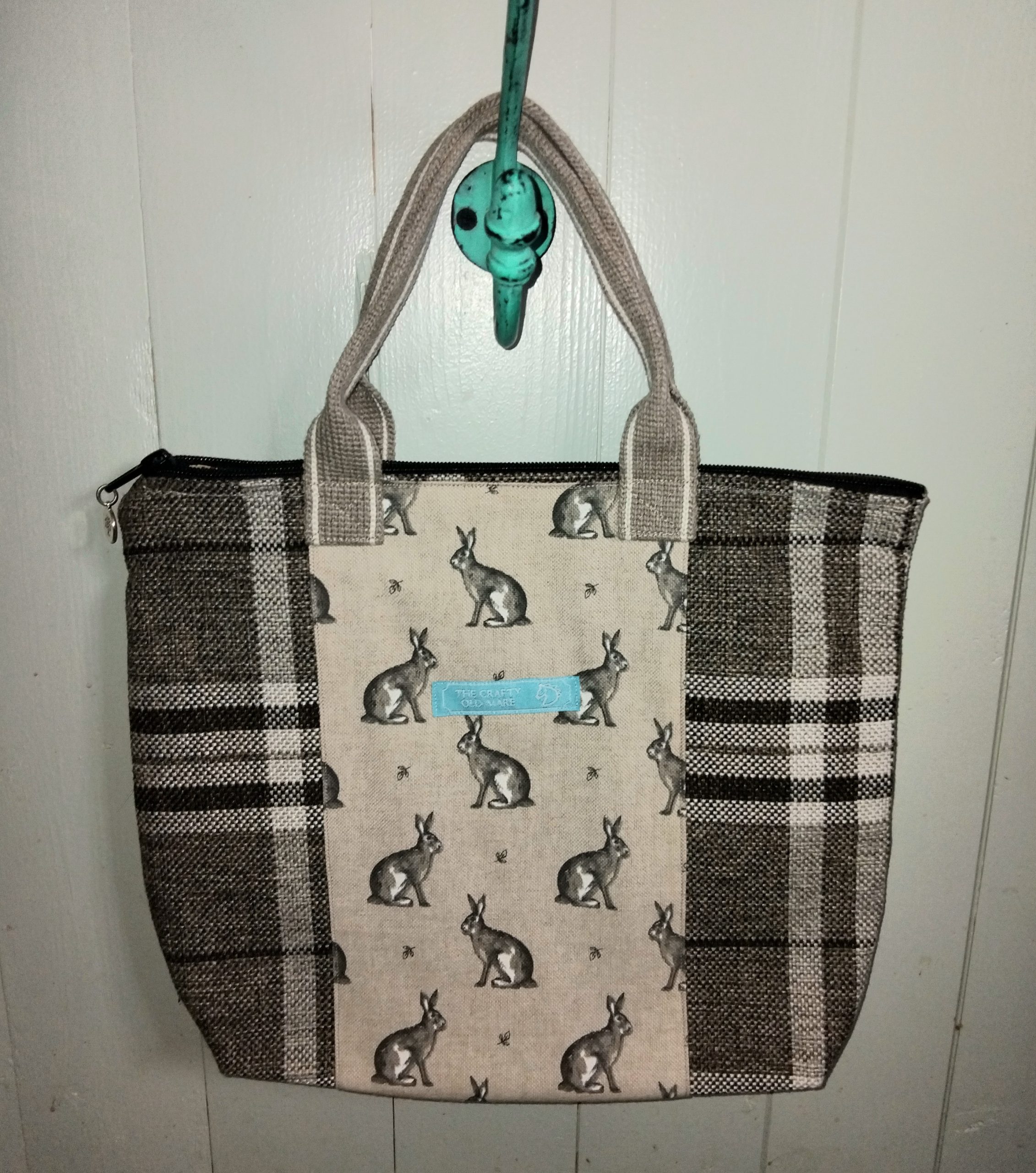 Small Brown, Cream and Beige Checked Bag with zip closure and Hare printed linen panel. Complimentary webbing handles. Brown faux leather fabric back. Shaped base and fully lined with pretty floral printed cotton. Features a silver coloured metal “My Family, My Love” charm on the zip pull. Branded with an embroidered TCOM label. Size approx 31cm x 26cm x 8cm (not including handles). Please note: Product is not waterproof.