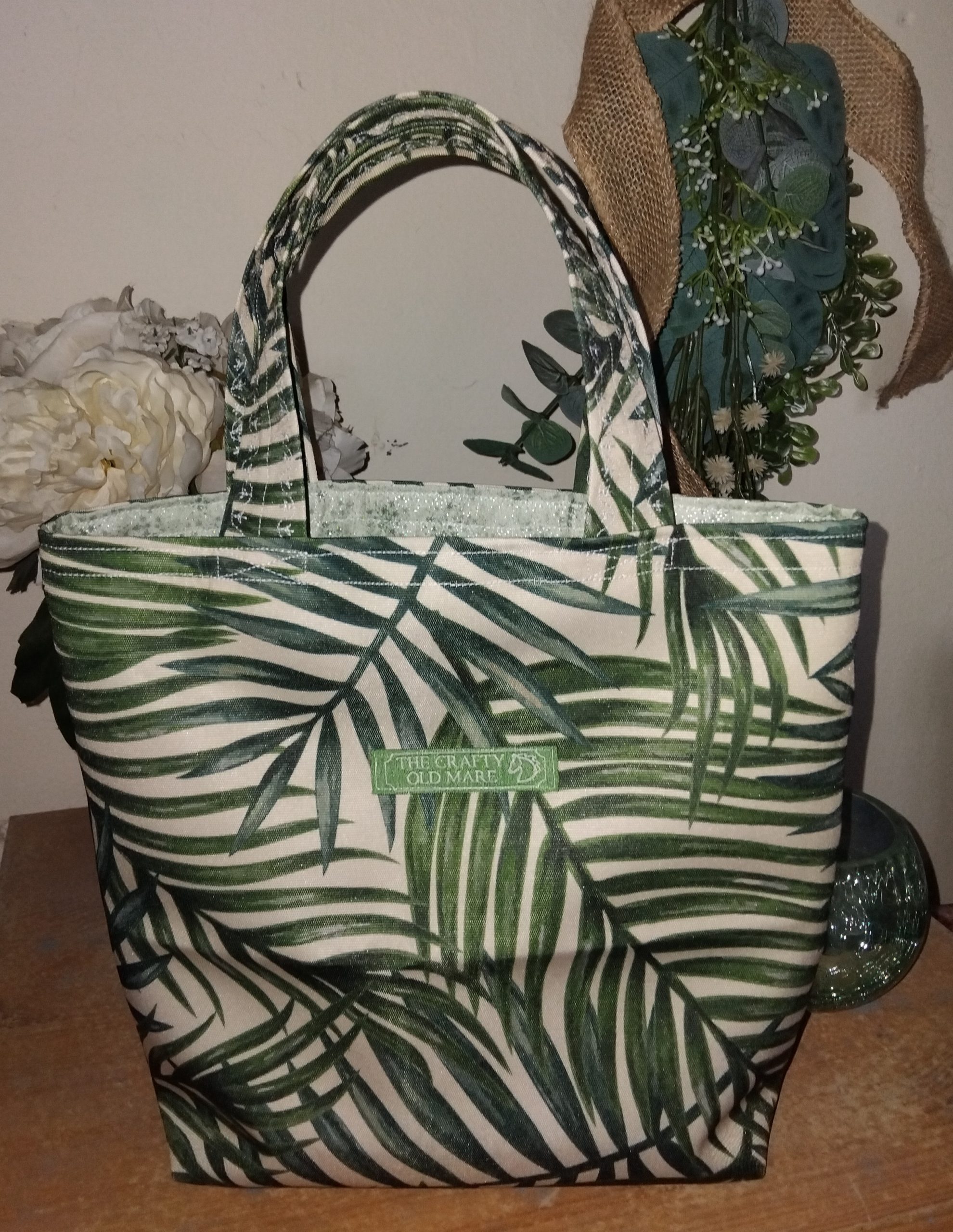 Small Green and Cream Fern Print Bag with matching material handles.
